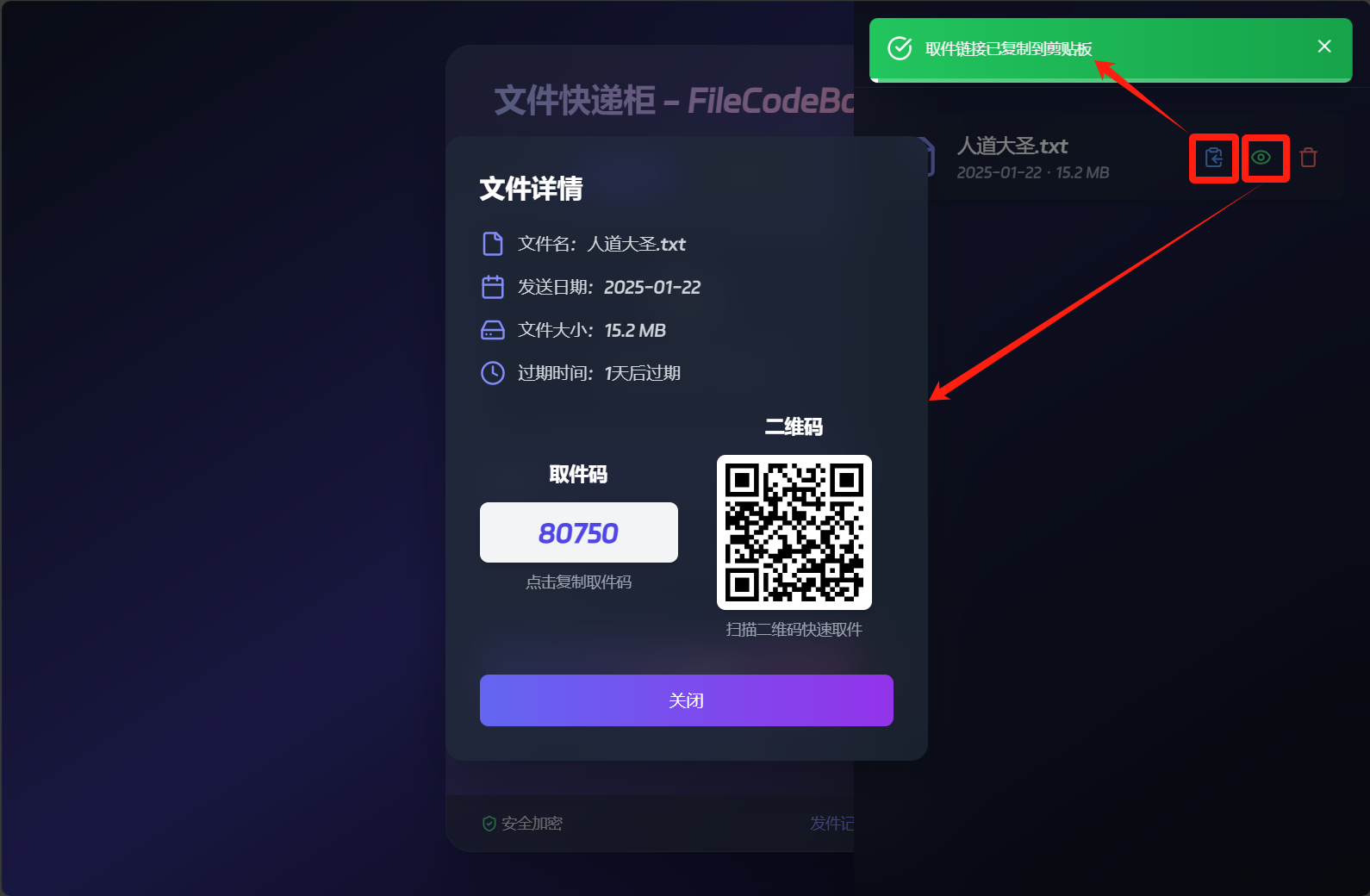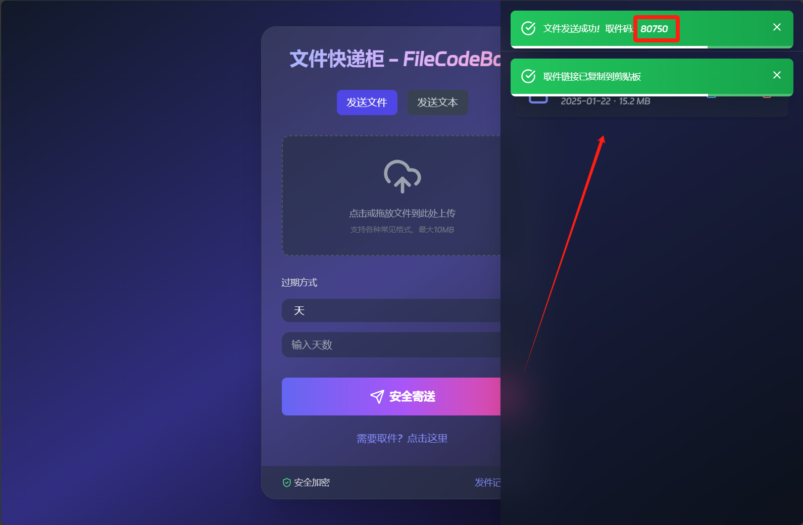上传后可以看到取件码