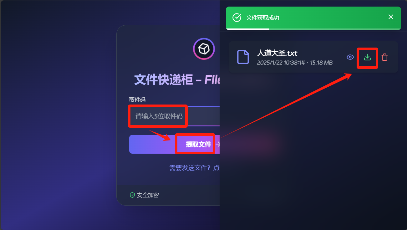 回到文件快递柜前台页面,粘贴你的取件码,可以自动弹出文件,选择下载。