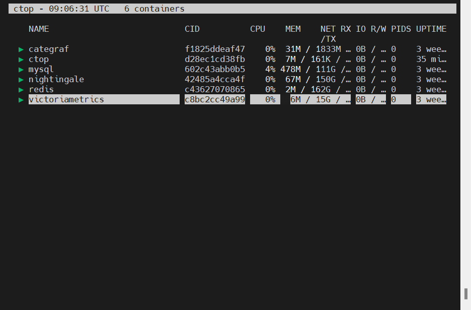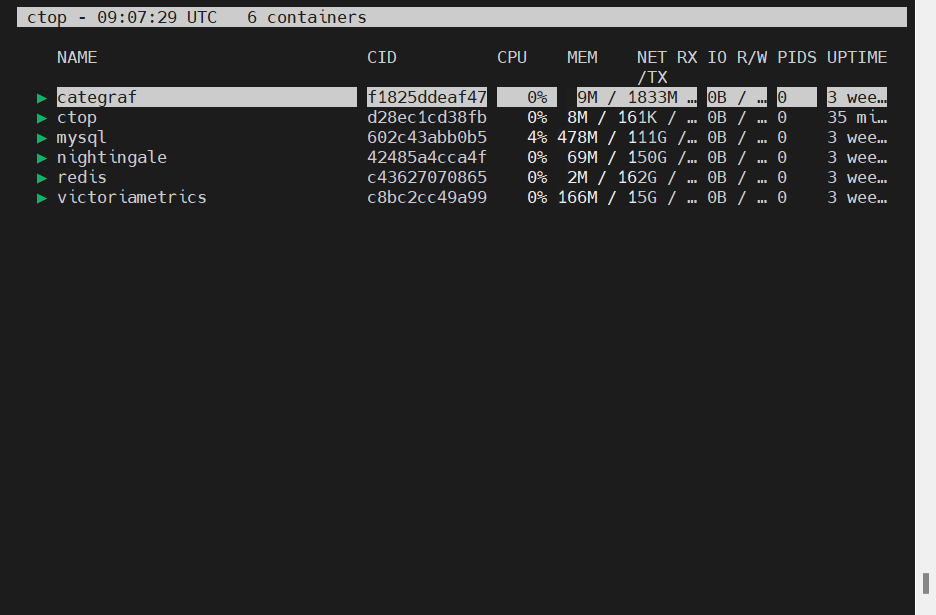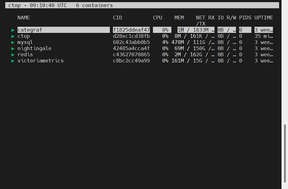 注意:此容器为单次运行!每次使用时需执行下面的命令进行使用!仅创建一个临时的容器。sudo docker run --rm -ti \ --name=ctop \ --volume /var/run/docker.sock:/var/run/docker.sock:ro \ quay.io/vektorlab/ctop:latest执行完上面的命令之后就自动进入容器交互页面
