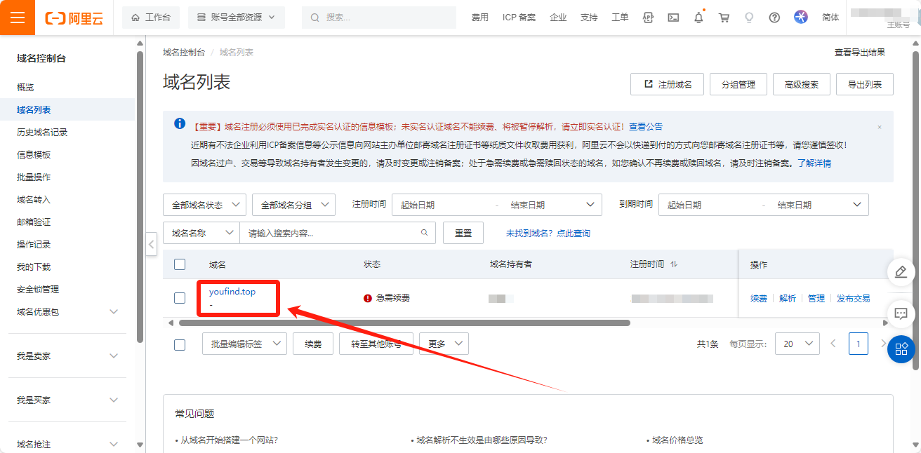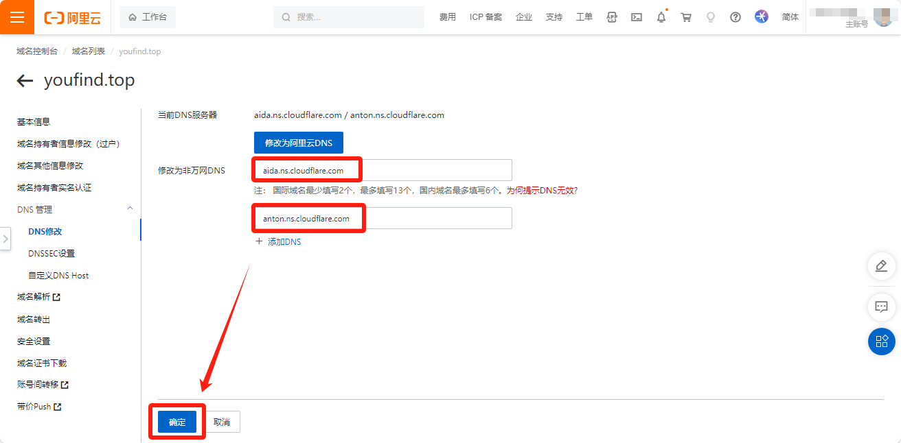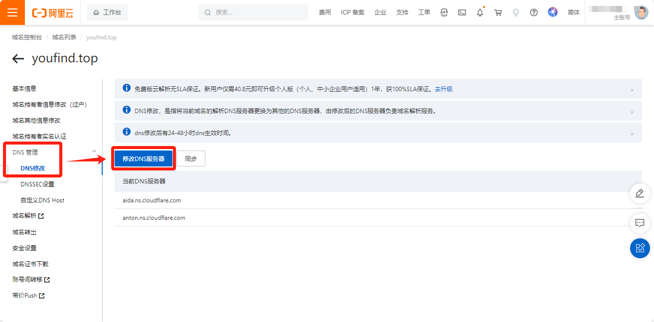 阿里云域名(腾讯域名不支持免费修改DNS服务器)