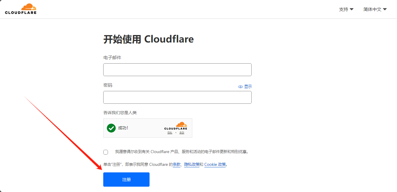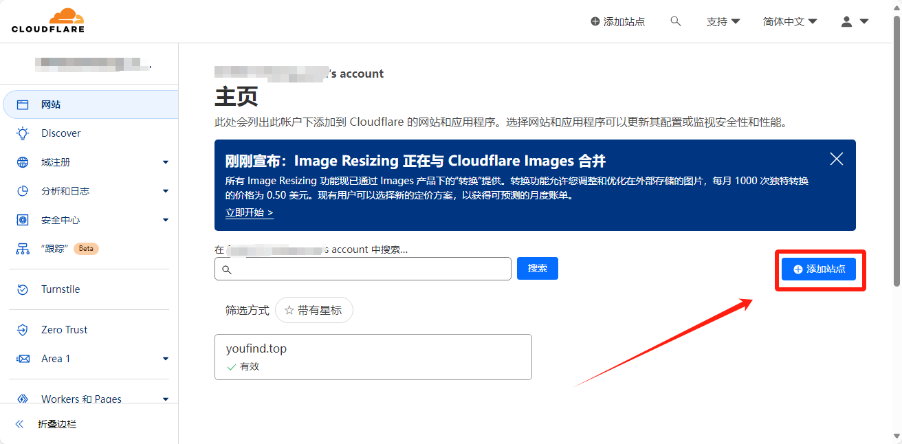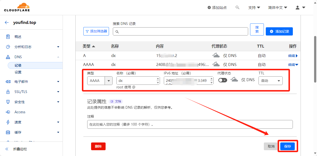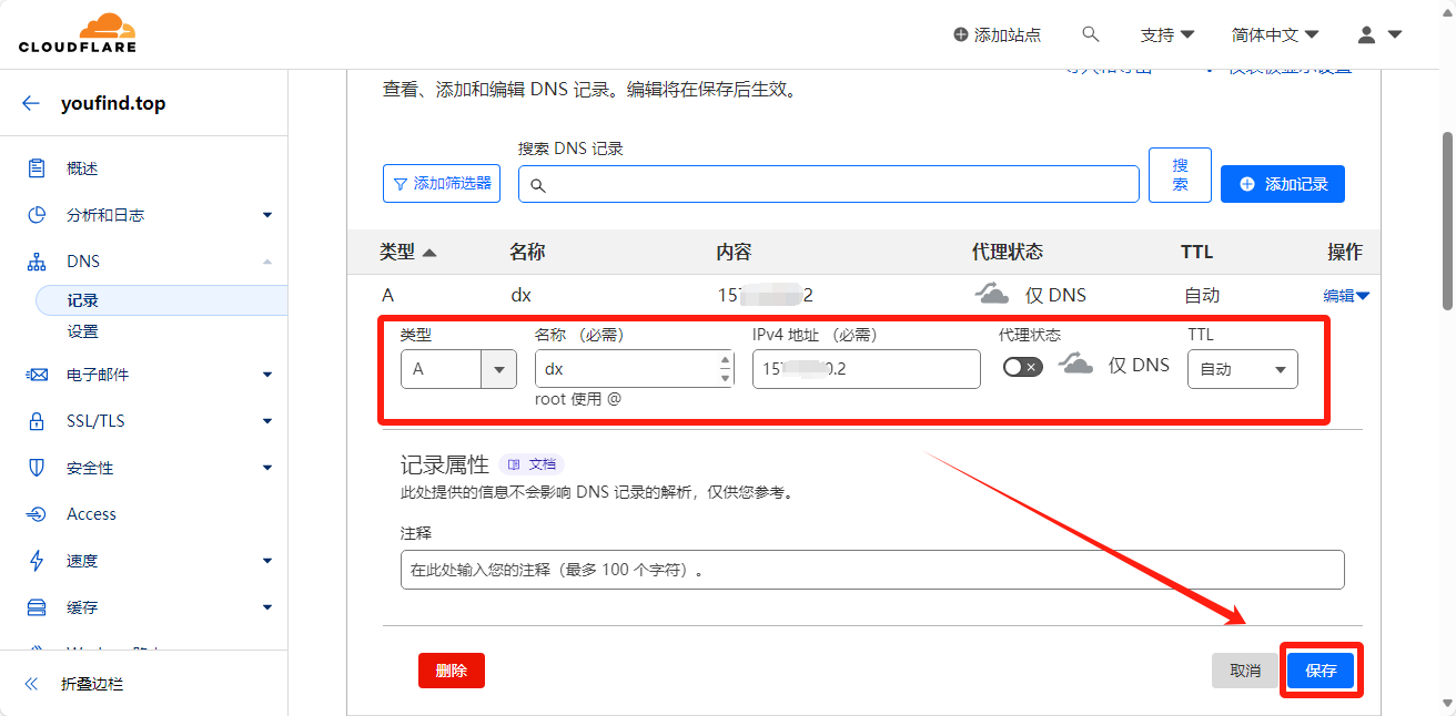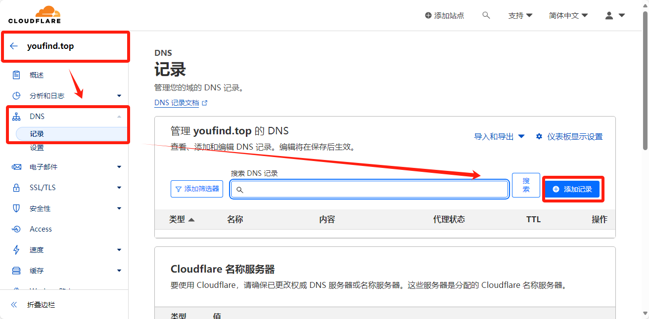 在CloudFlare中选择你的域名--DNS--记录--添加记录