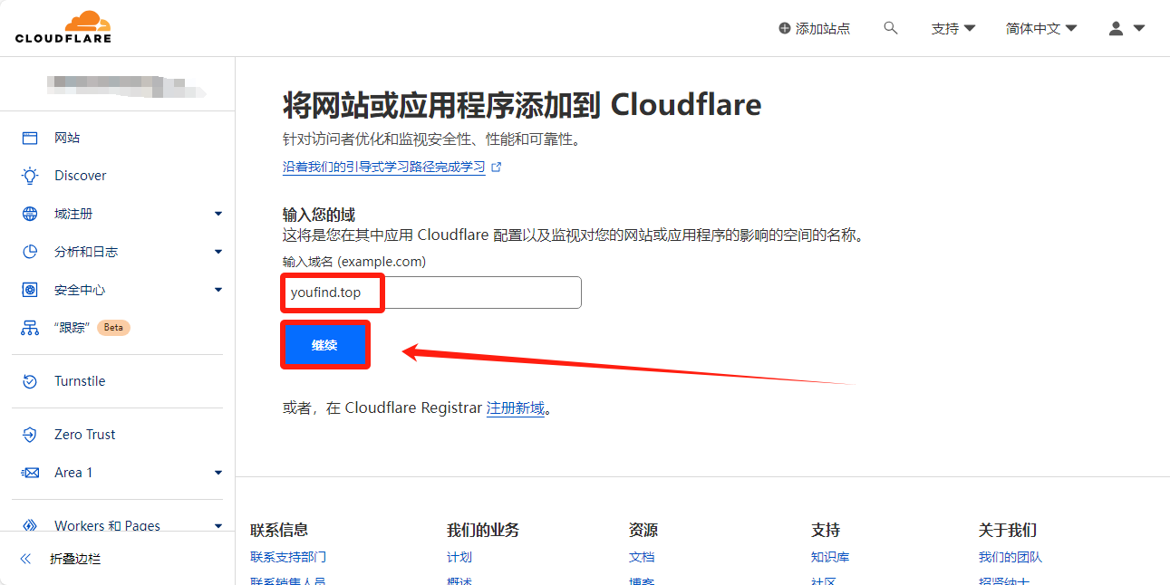 等CloudFlare扫描完你的域名解析的记录,点击继续。