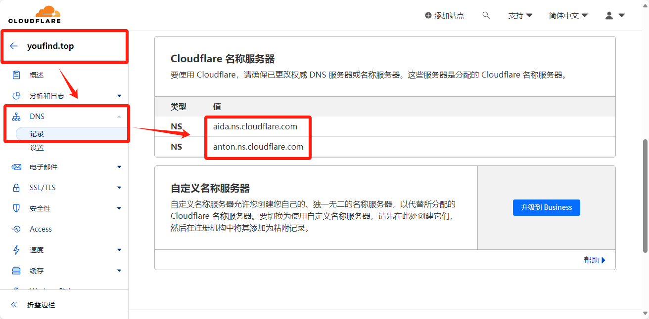 CloudFlare的DNS地址在域名的DNS--记录内。