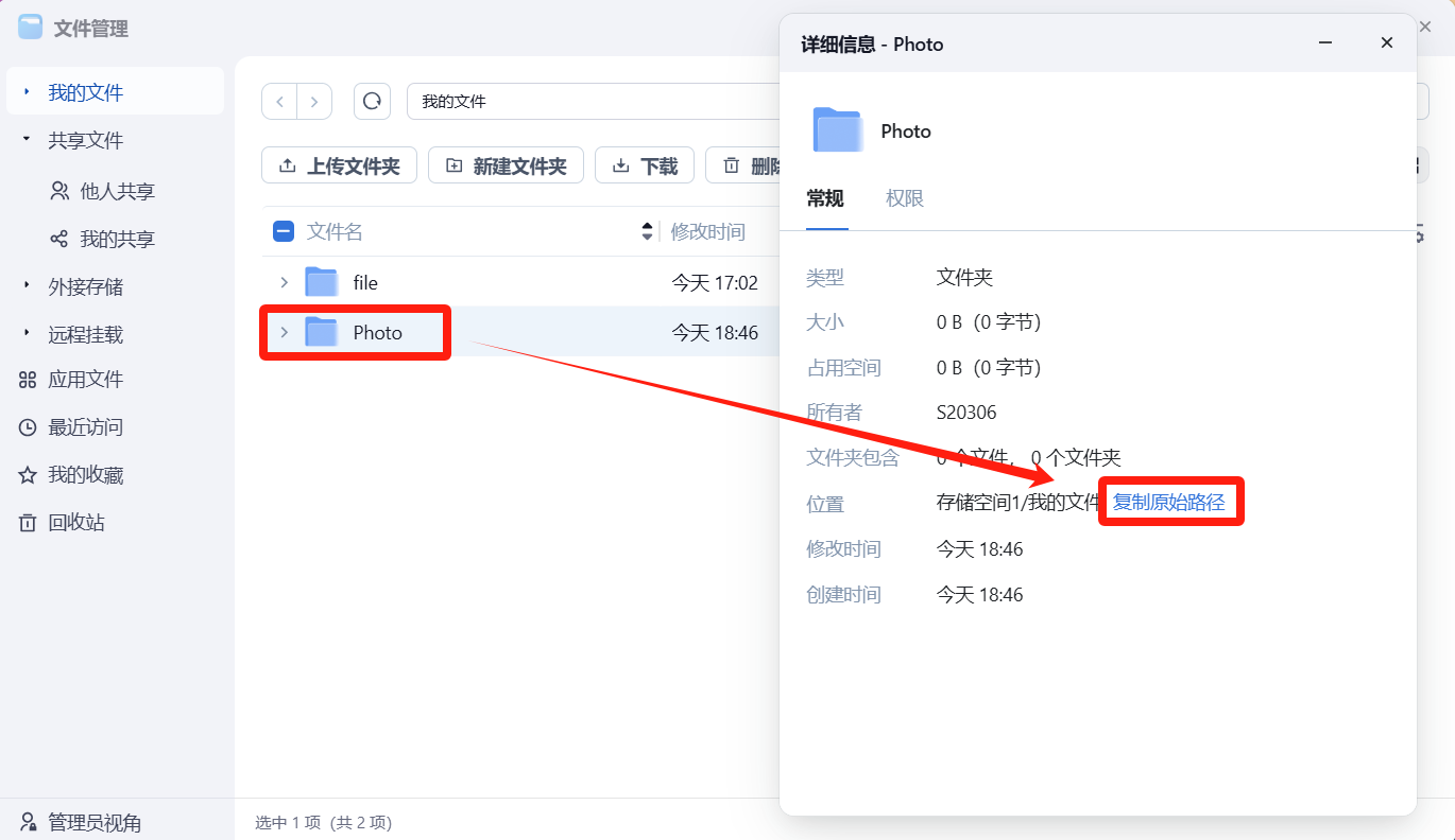 在NAS系统的文件管理中新建一个文件夹,右键选择文件详细信息(属性),点击