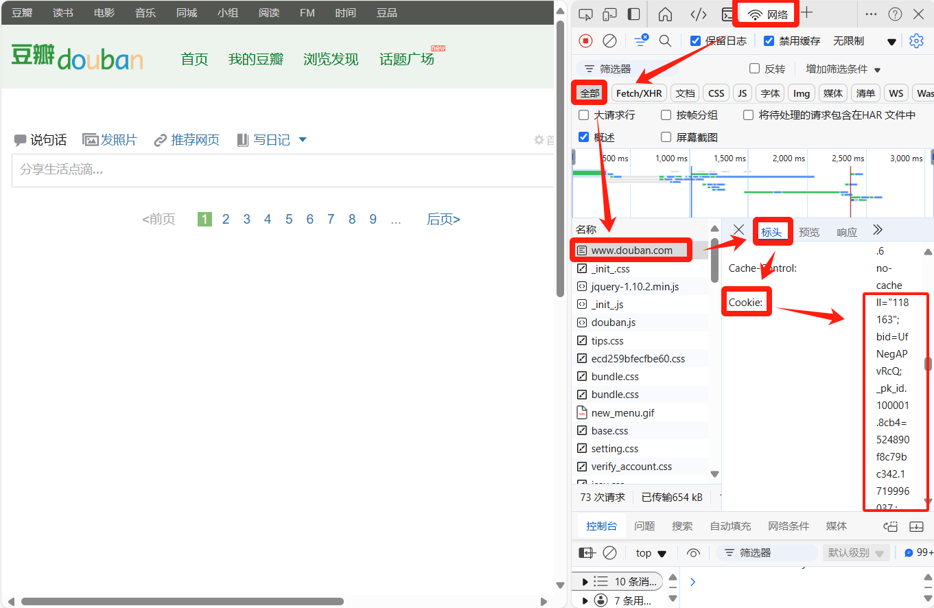 点击网络--全部--刷新一下网页--找到豆瓣网址--标头--Cookie,复制整个Cookie值。