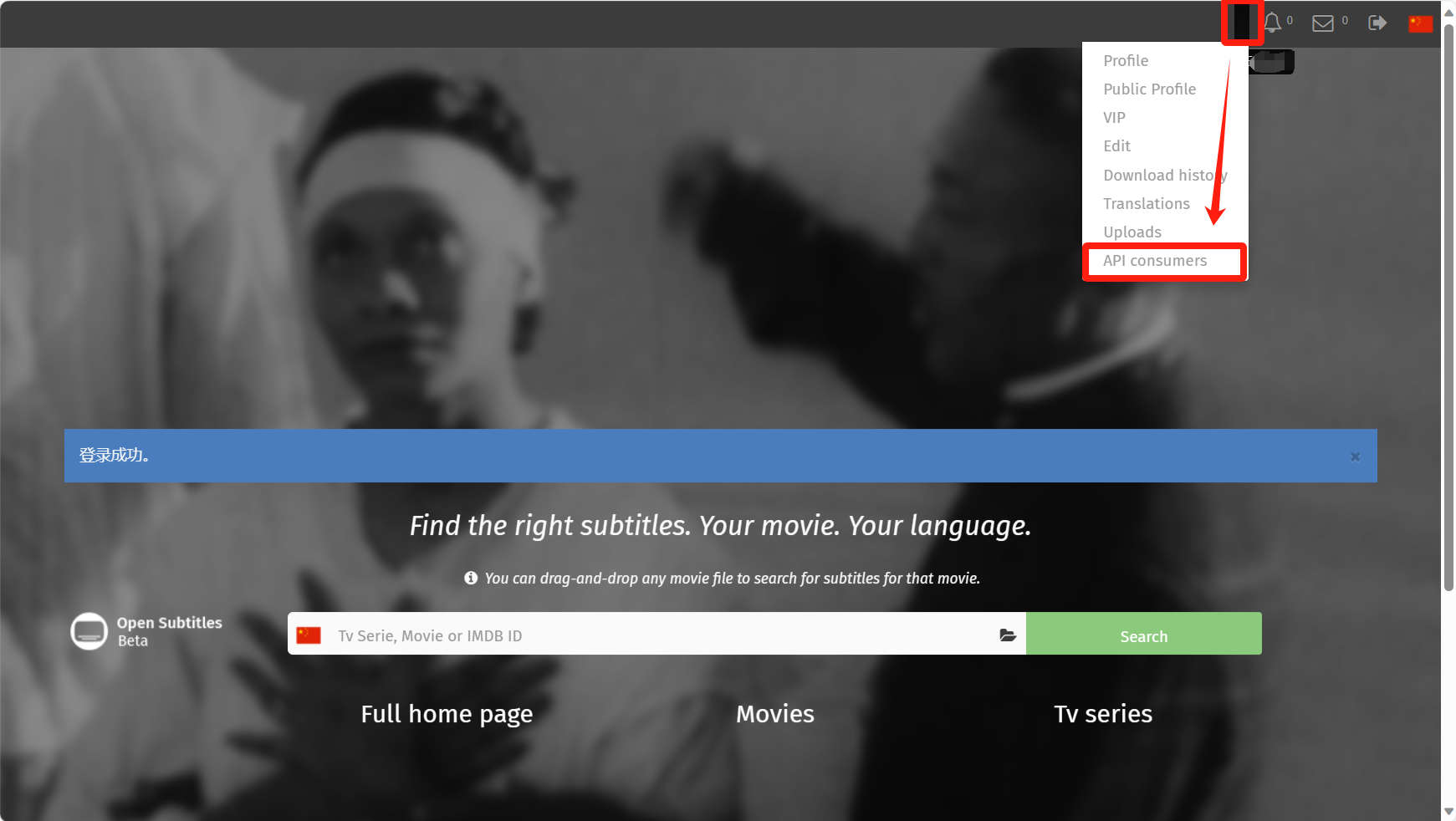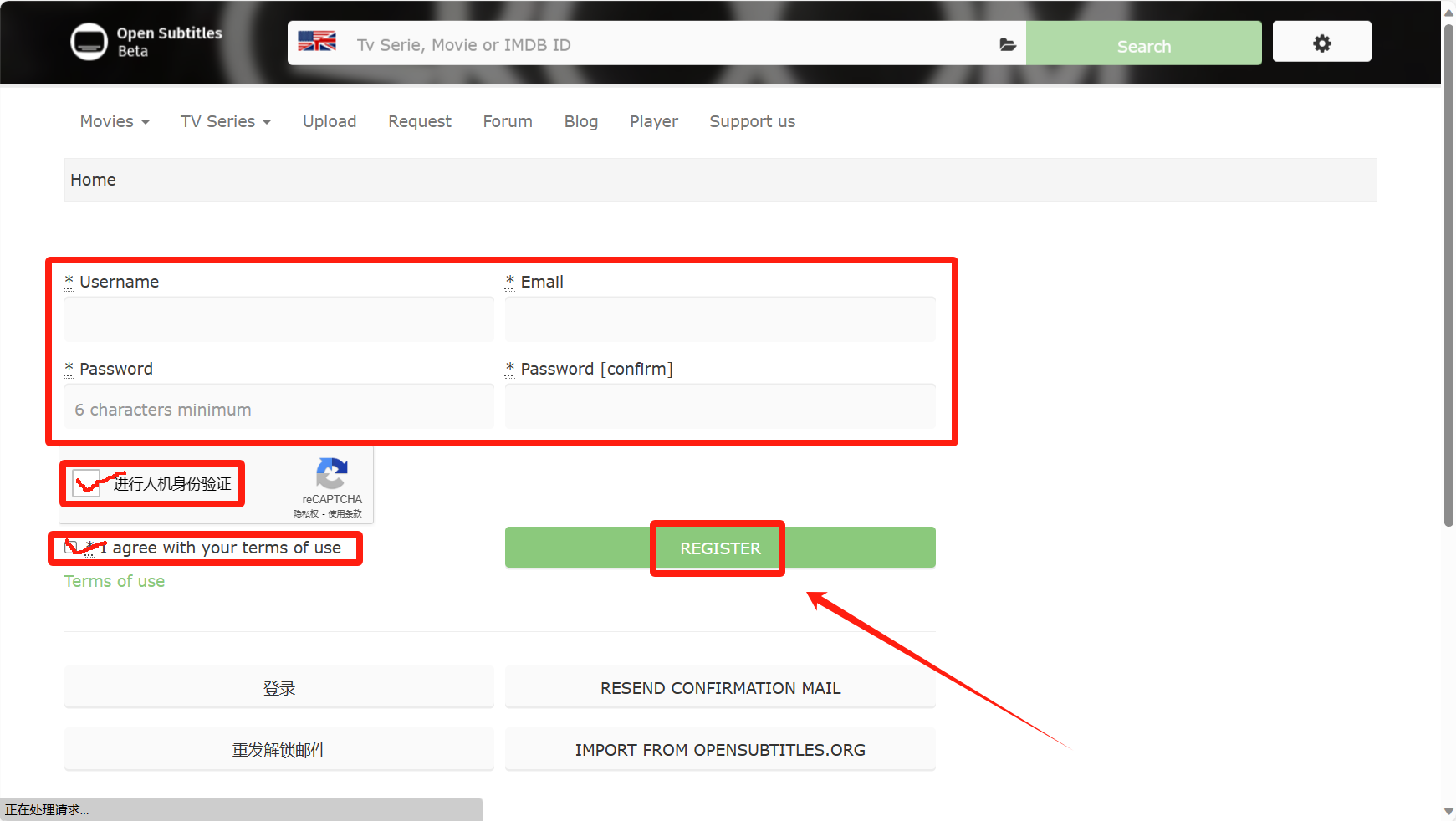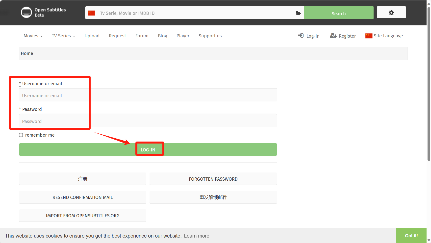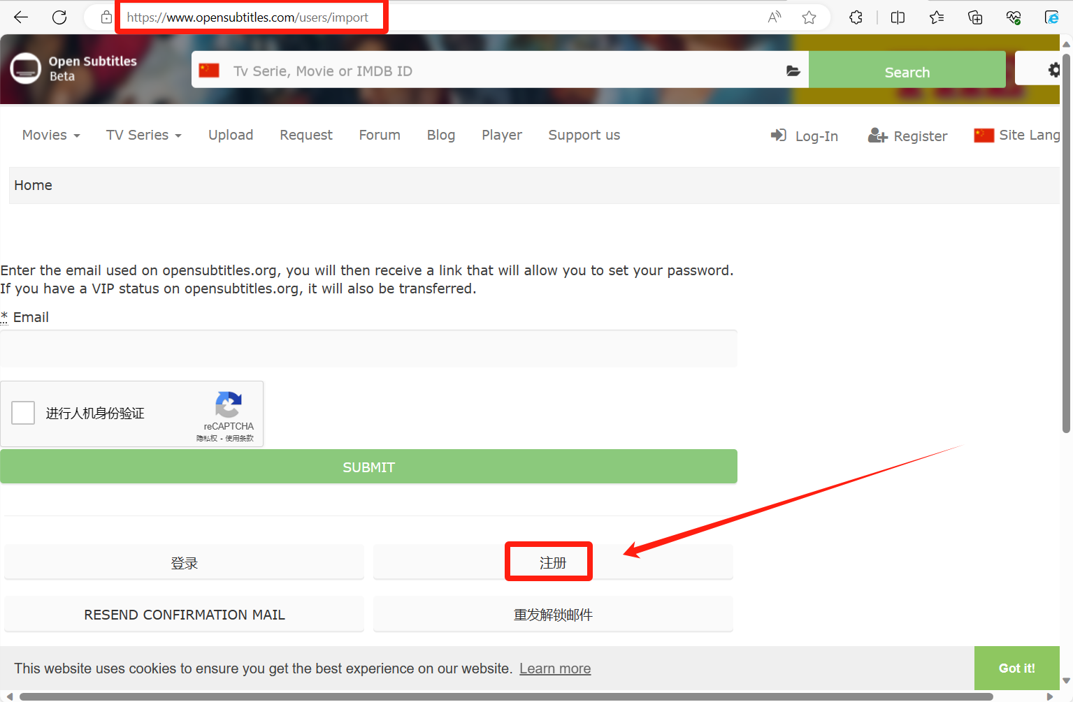 打开OpenSubtitles官网 https://www.opensubtitles.com/users/import