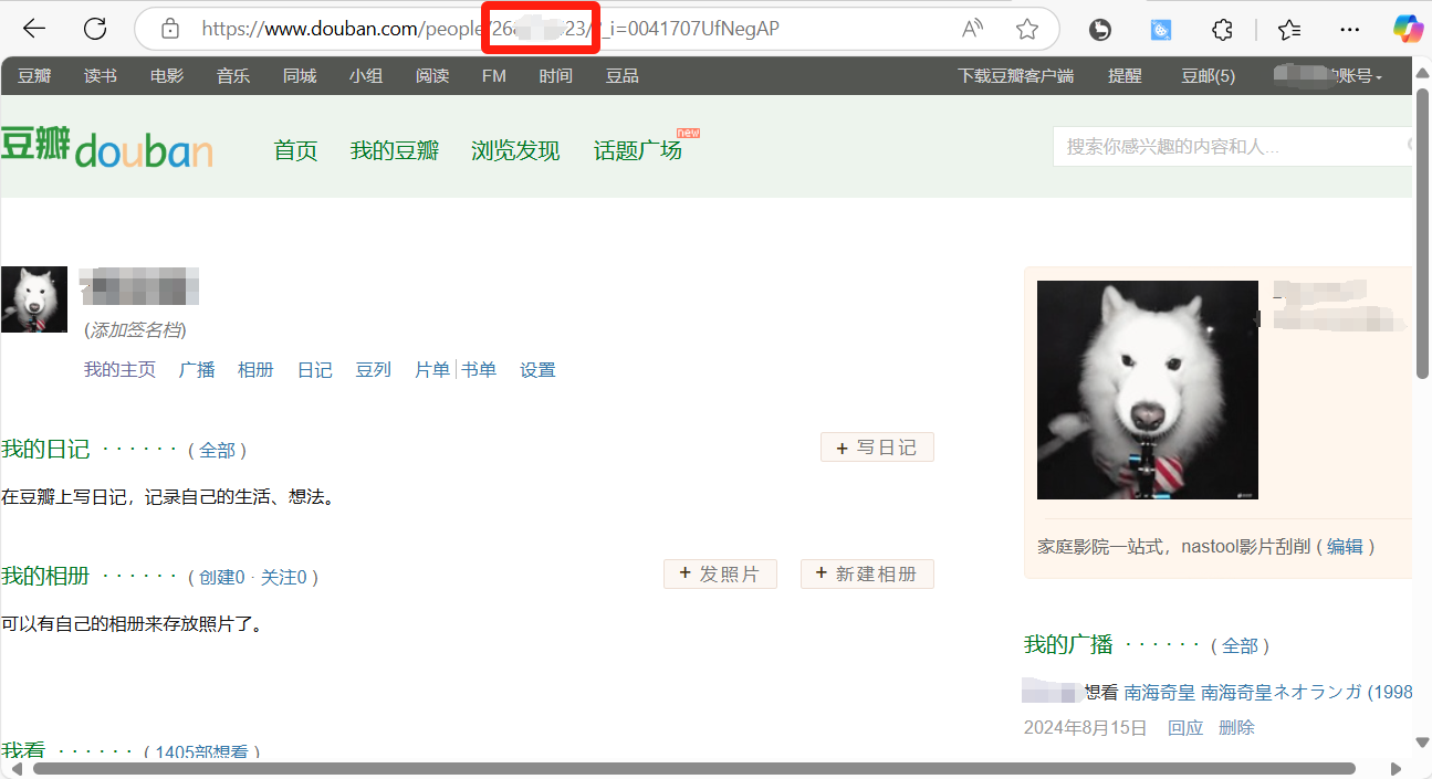 浏览器顶部的ID就是你的豆瓣ID(只有近几年注册的才是数字ID)
