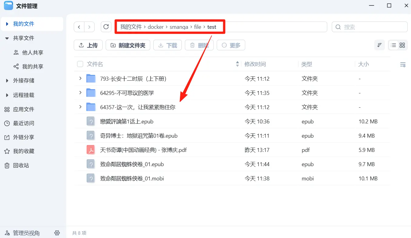 进入 NAS 内项目文件夹的 file 文件夹,可以按分类建立子目录,然后上传漫画文件。