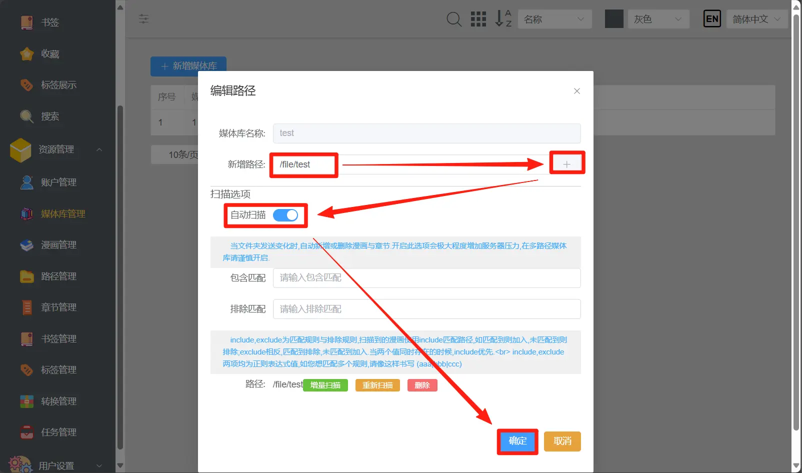 • 在新增路径中输入你创建的漫画分类文件夹路径,然后点击旁边的+号,启用自动扫描,然后点击确定。