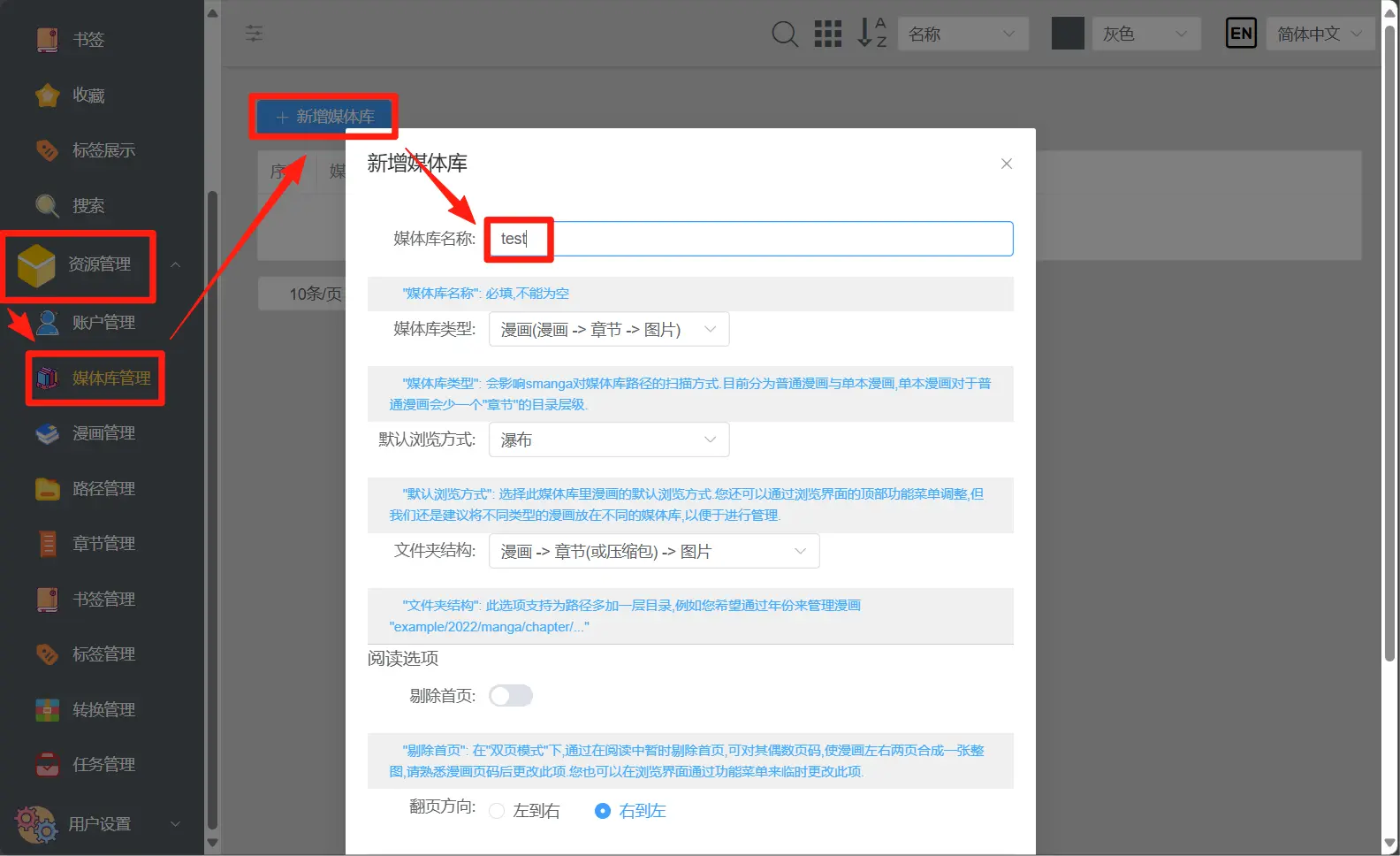 • 进入后台后,点击 资源管理 → 媒体库管理 → 新增媒体库,设置名称(等于是分类/自定义文件夹),然后下拉到底部点击确定。