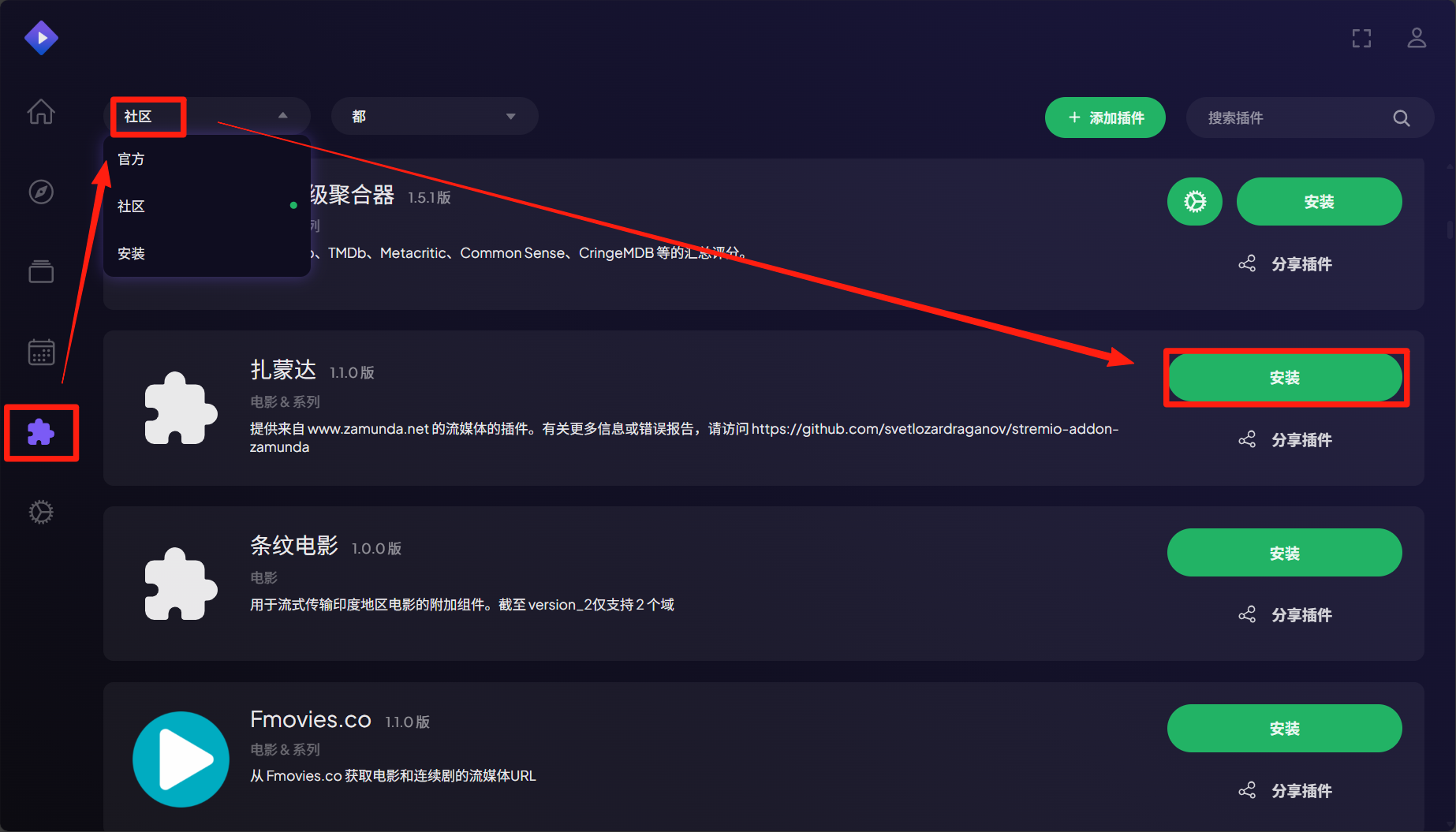 点击插件,选择社区,首选安装Zamunda插件,其余的自己打开浏览器翻译,自己按需安装,然后选择不互相冲突的插件,能安装多少就安装多少吧。