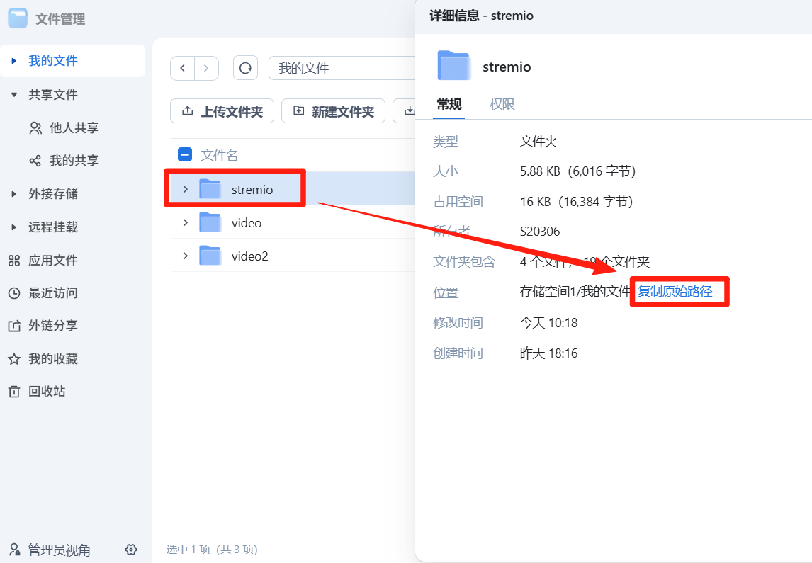 在NAS上新建一个项目文件夹,右键选择详细信息(属性),复制文件夹的路径。