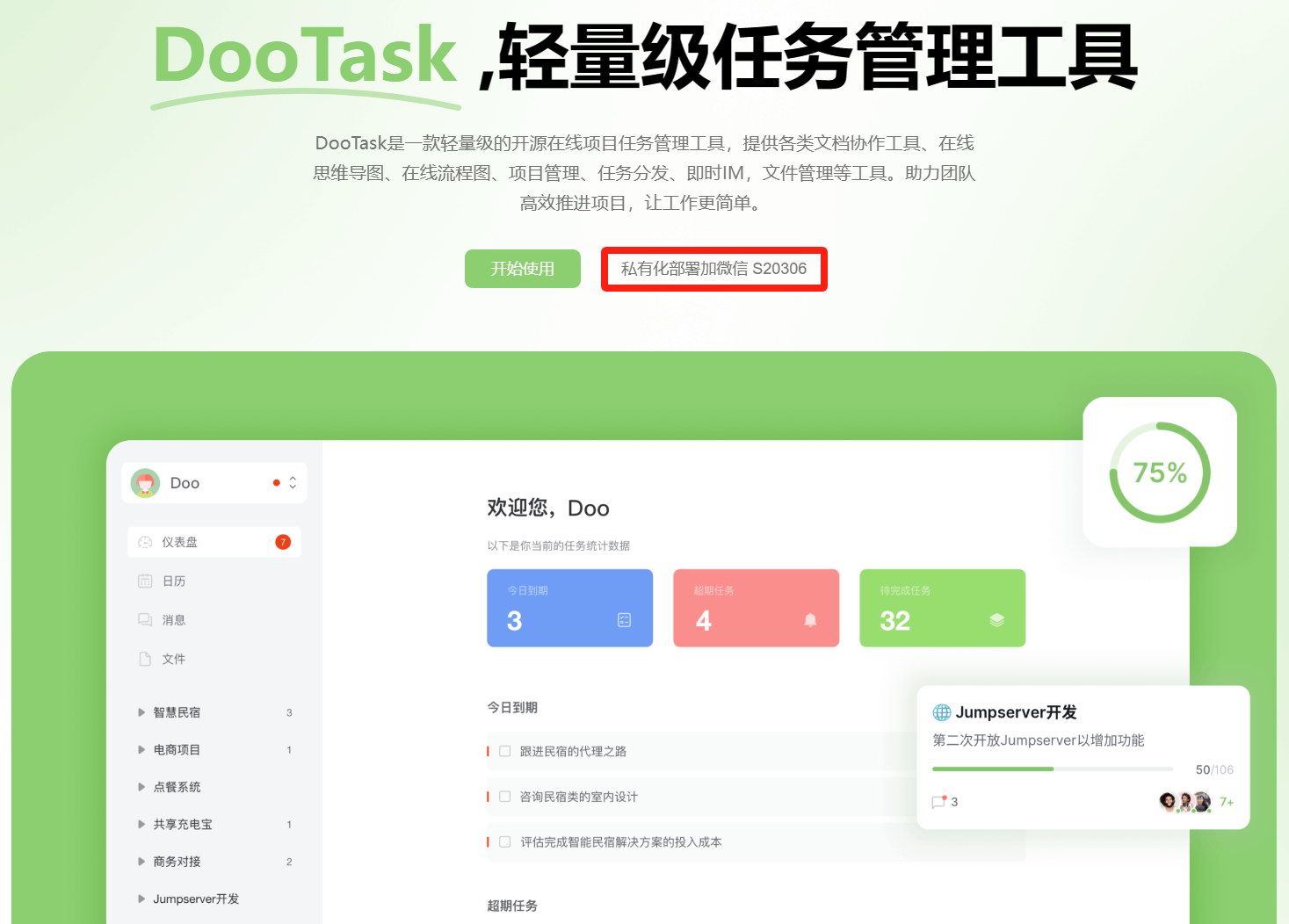 DooTask是一款轻量级的开源在线项目任务管理工具,提供各类文档协作工具、在线思维导图、在线流程图、项目管理、任务分发、即时IM,文件管理等工具。助力团队高效推进项目,让工作更简单。