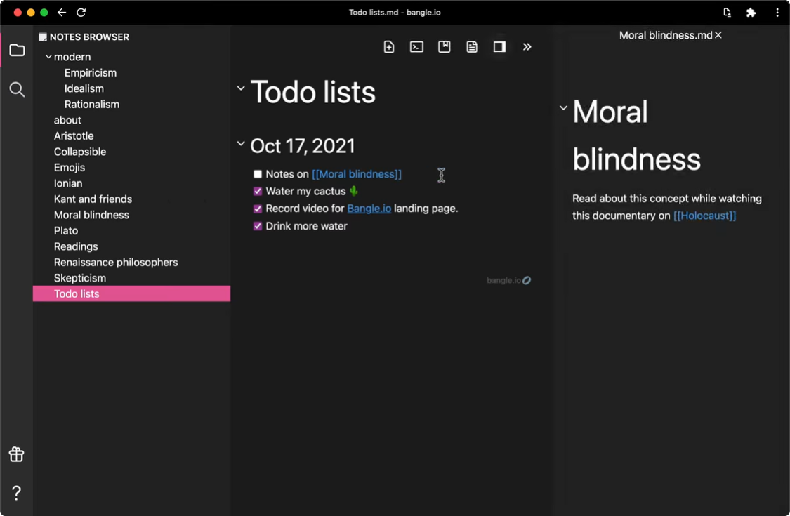 • 本地化 Markdown 笔记(含todolist功能): Bangle.io 使用 Markdown 格式存储笔记,并提供所见即所得的编辑体验。这意味着你可以直接在浏览器中使用 Markdown 语法,并实时看到最终的格式效果,无需切换到代码视图。