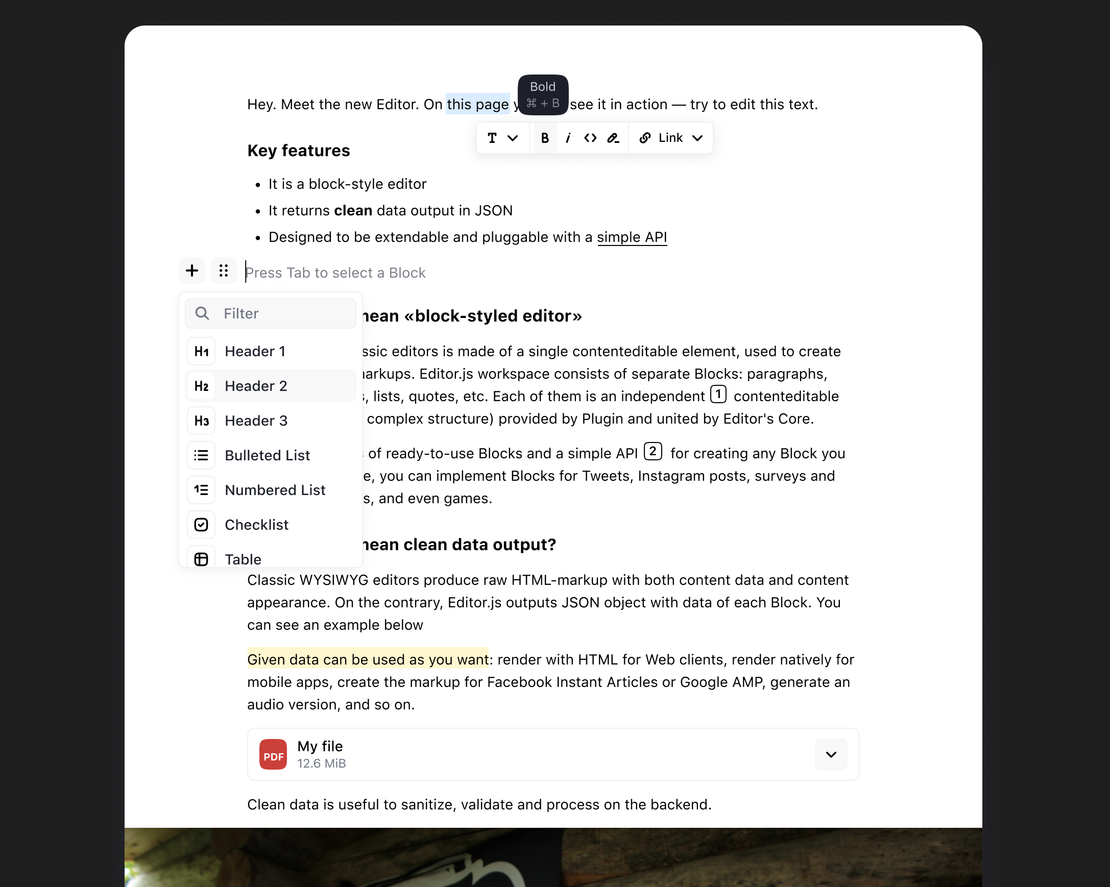 CodeX Docs利用Editor.js作为编辑引擎,为用户提供了丰富的功能和工具,使文档创建和编辑变得简单而愉快。以下是一些主要功能: