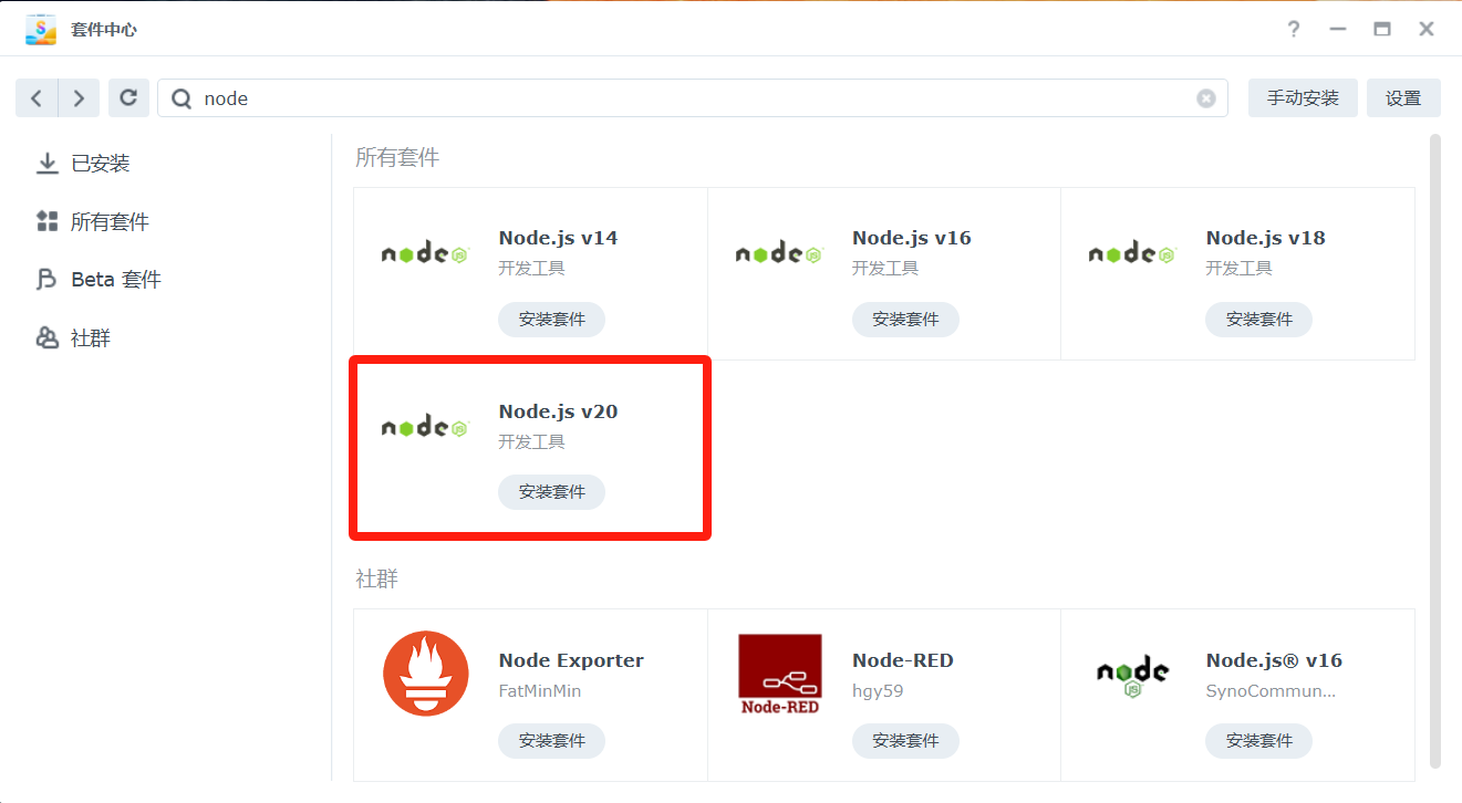 在群晖套件中心安装Node.js v20(官方文档要求使用的Node.js不低于Node.js v16作为依赖。)