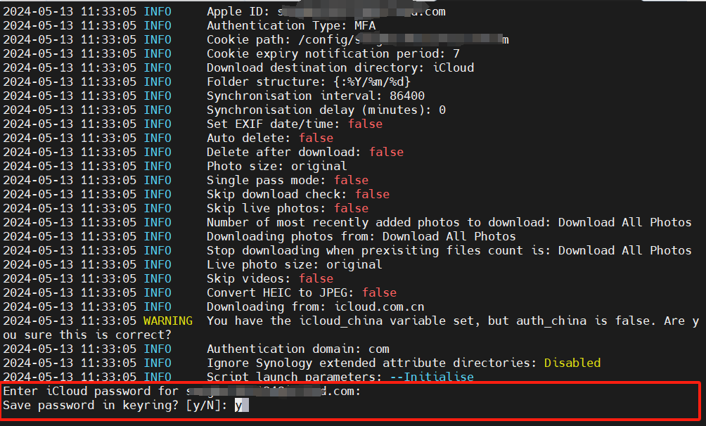 /usr/local/bin/sync-icloud.sh --Initialise等看到下面这行提示时,输入你的Apple ID的密码(输入时不显示),然后按Enter键确认。