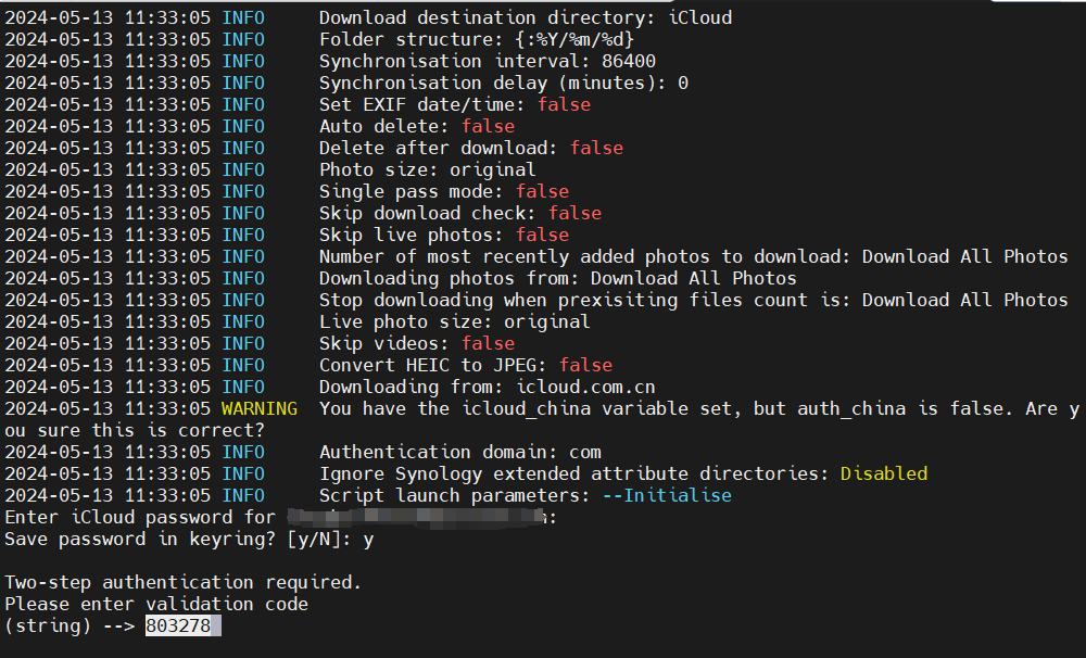 version: "3" services: icloudpd: privileged: true container_name: iCloud hostname: icloudpd_boredazfcuk networks: - icloudpd_bridge restart: always environment: - TZ=CST-8 - icloud_china=flase #如果无法解析到iCloud,就将flase改成True,换成国内的iCloud。 - apple_id=********* #换成你的Apple ID - authentication_type=MFA #已开启双重验证就是MFA,否则换成web。 - download_path=/home/${user}/iCloud volumes: - /volume1/docker/iCloud/config:/config #前面的文件夹路径换成你自己的 - /volume1/docker/iCloud/Photos:/home/${user}/iCloud #前面的文件夹路径换成你自己的 image: boredazfcuk/icloudpd:stable #后面的:stable为可选项,可不加,为了区分镜像版本而已。 networks: icloudpd_bridge: external: true name: icloudpd_bridge volumes: icloudpd_boredazfcuk_config: external: name: icloudpd_boredazfcuk_config执行命令,启动docker-compose文件,拉取镜像并创建容器。