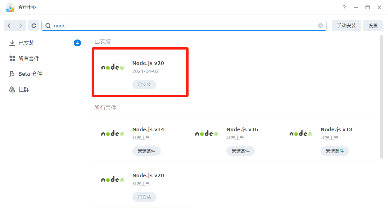 群晖NAS系统:套件中心安装Node.js对应版本的套件