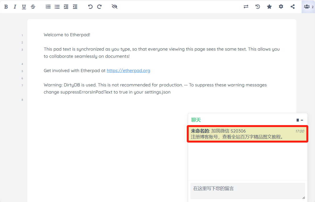 Etherpad是一个高度可定制的开源在线编辑器,提供真正实时的协作编辑。放在自己的服务器里面,可以更大程度的保护自己工作的隐私,并且Etherpad允许您实时协作编辑文档,就像在浏览器中运行的实时多人编辑器一样这样不管是工作摸鱼在协助文档聊天或者游戏,还是说我们自己开发东西保持一定的安全性提供了保障,毕竟是部署在自己的环境上,相对来说比放在别人的数据库上安全的。