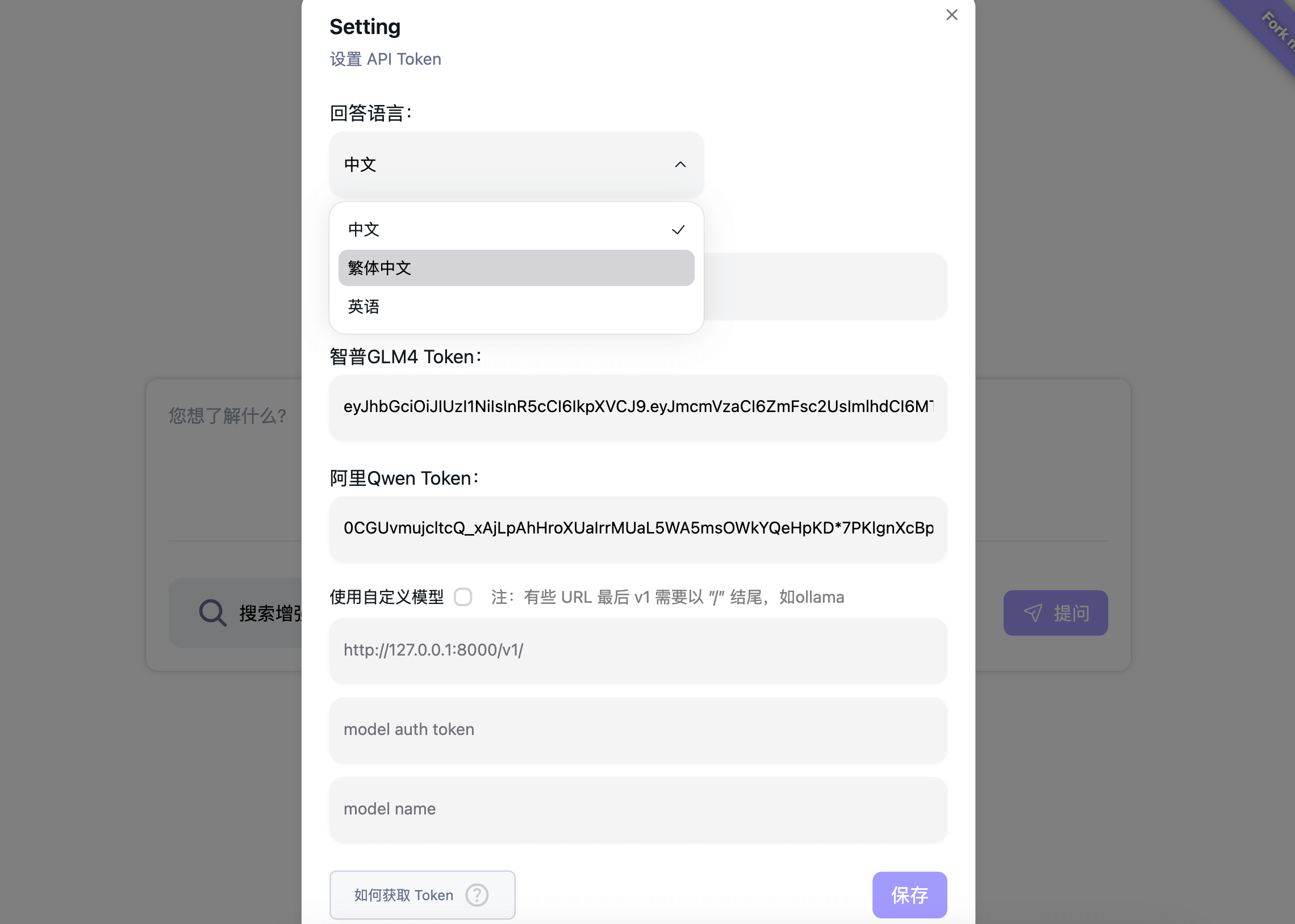 (如何获取和设置Kimi / Qwen / ZhipuAI Token?可在Github项目地址内查看,地址见文末。)