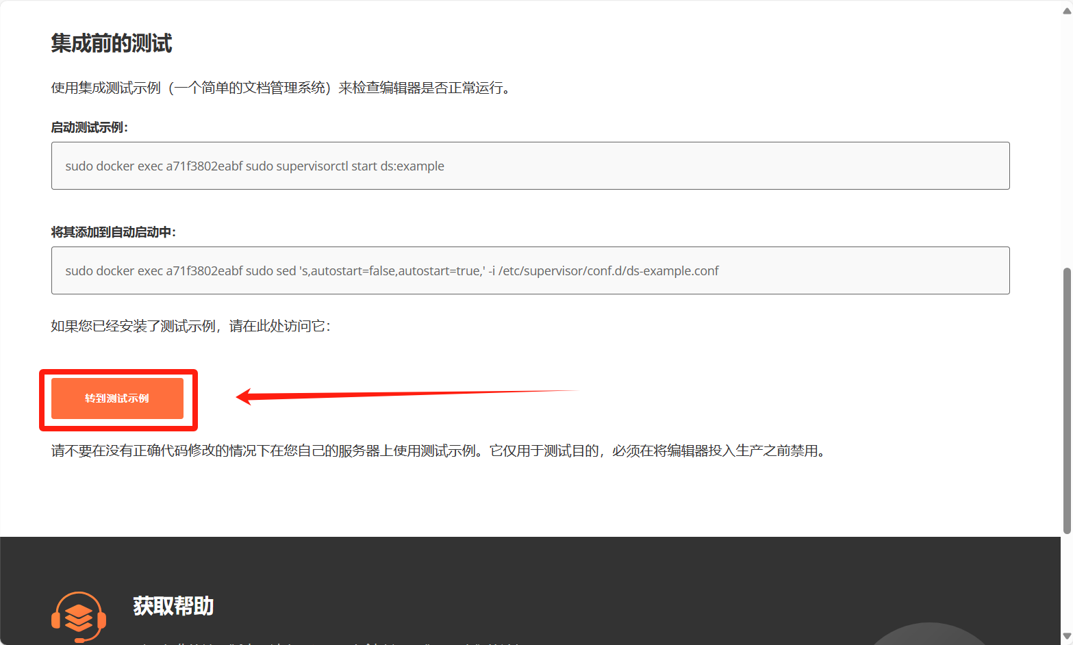 复制启动测试示例中的命令,粘贴到终端内执行。