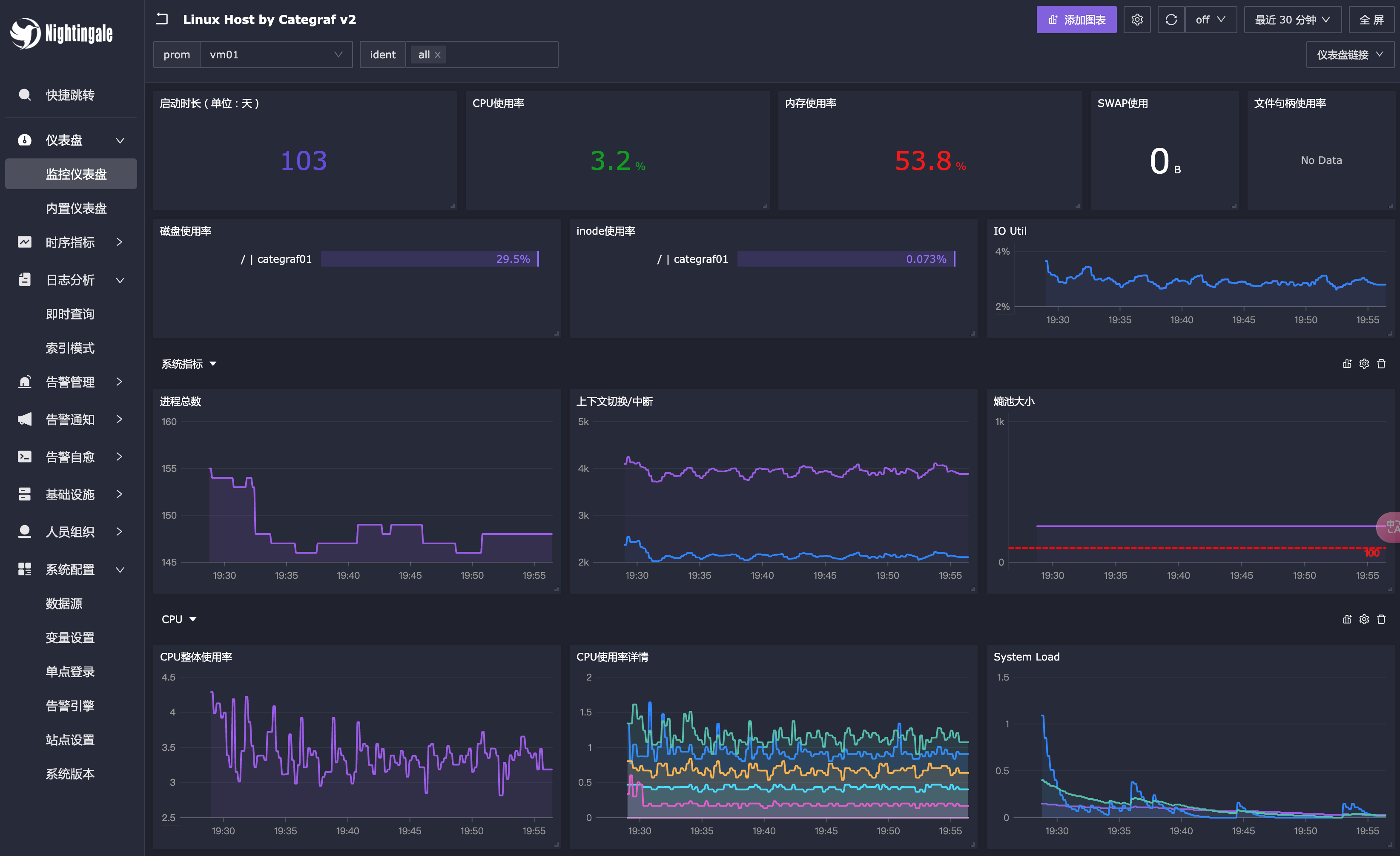 高性能可视化引擎:支持多种图表样式,内置众多 Dashboard 模版,也可导入 Grafana 模版,开箱即用,开源协议商业友好。
