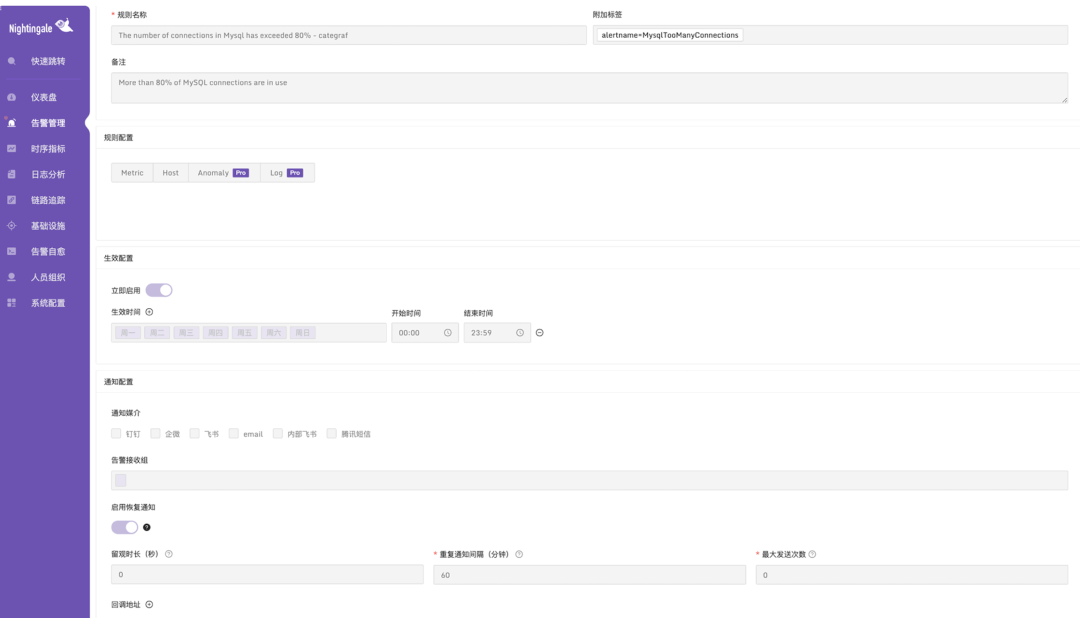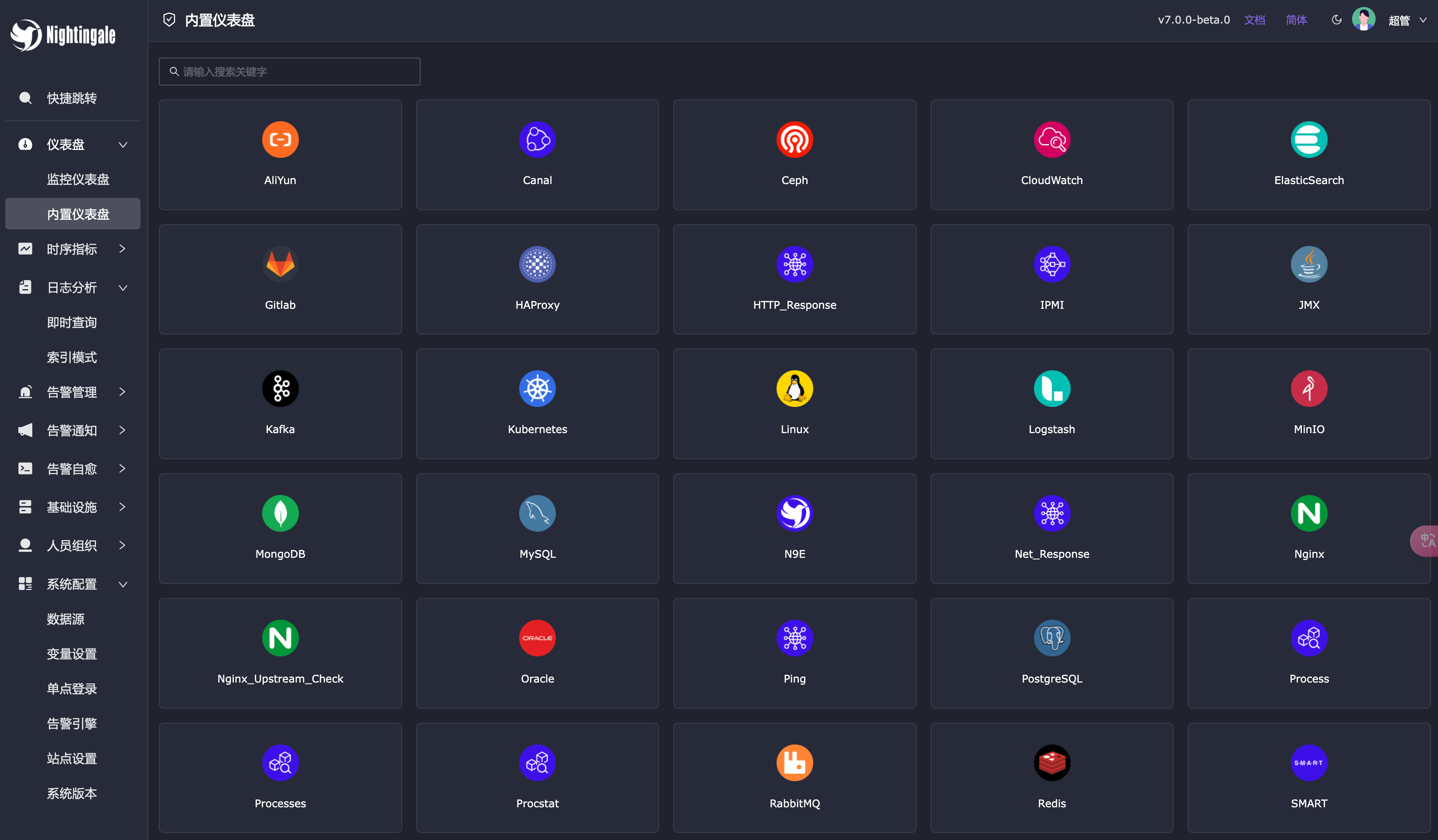 专业告警能力:内置支持多种告警规则,可以扩展支持常见通知媒介,支持告警屏蔽/抑制/订阅/自愈、告警事件管理。