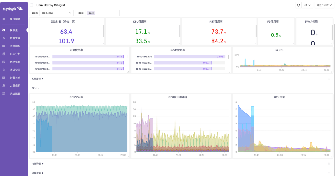 夜莺(Nightingale)是一个 All-in-One 的云原生监控工具,集合了 Prometheus 和 Grafana 的优点,你可以在 UI 上管理和配置告警策略,也可以对分布在多个 Region 的指标、日志、链路追踪数据进行统一的可视化和分析。夜莺融入了顶级互联网公司可观测性最佳实践,沉淀了众多社区专家经验,开箱即用。