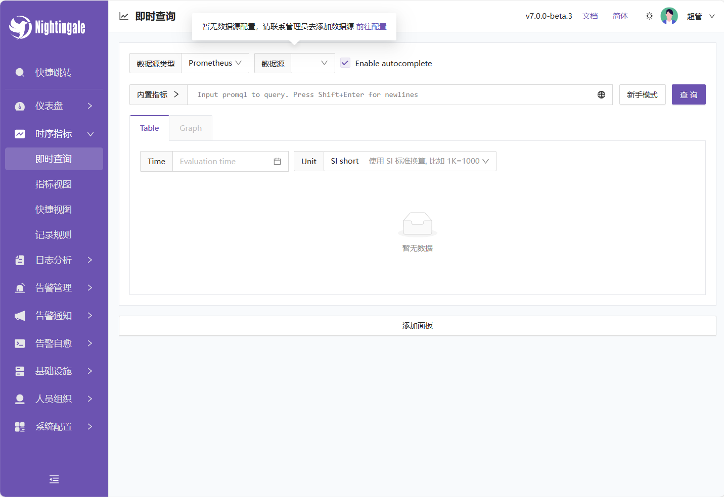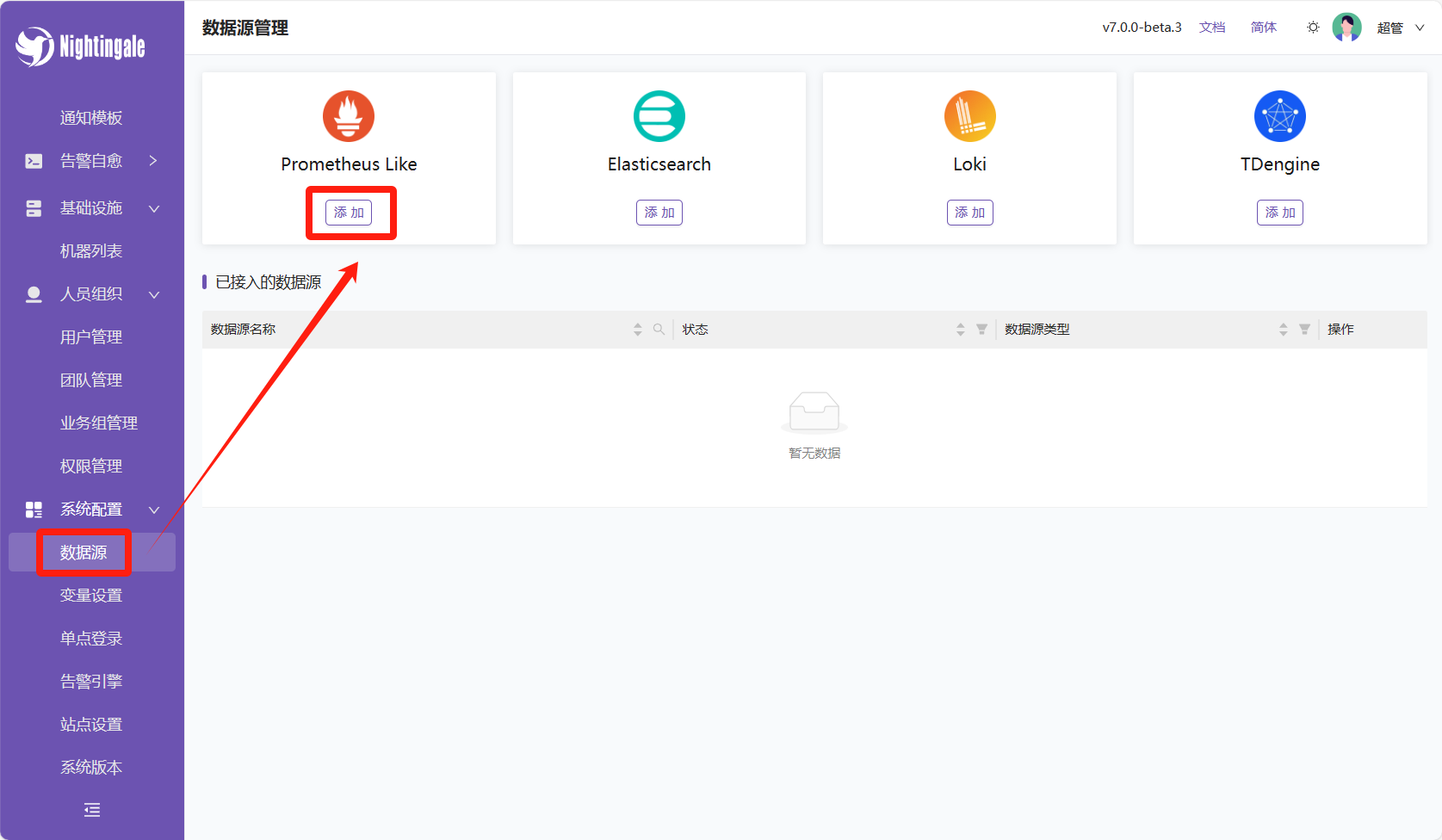 点击系统配置--数据源,选择Prometheus Like点击添加。(演示随意选择一种教学)