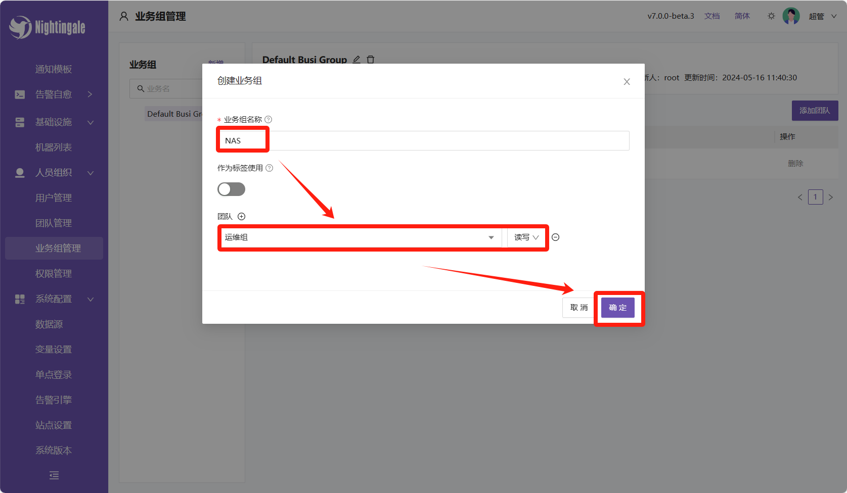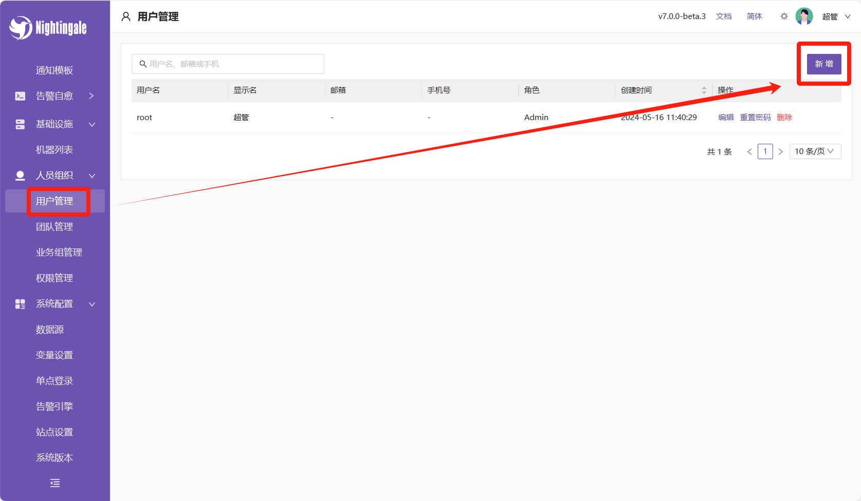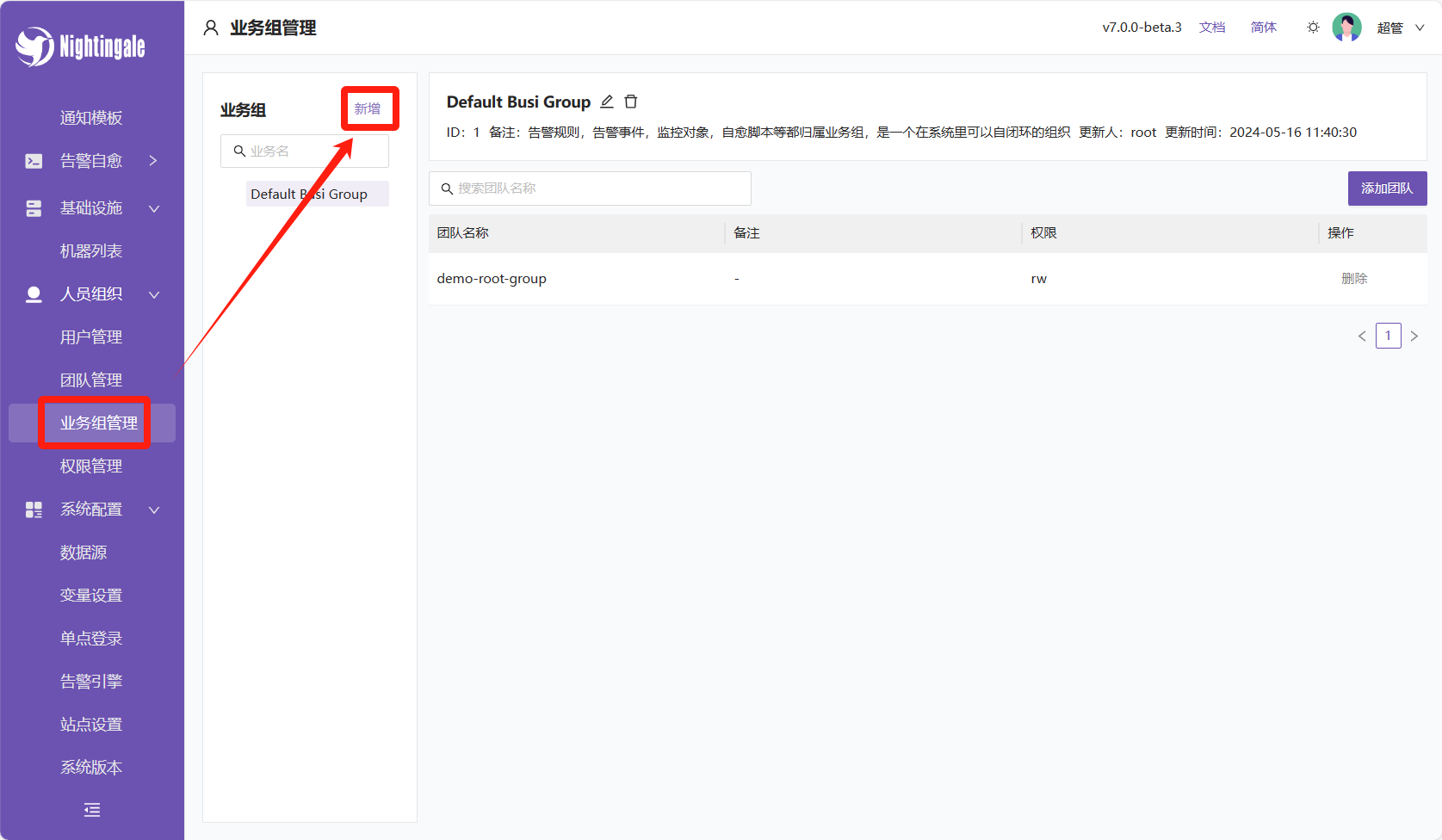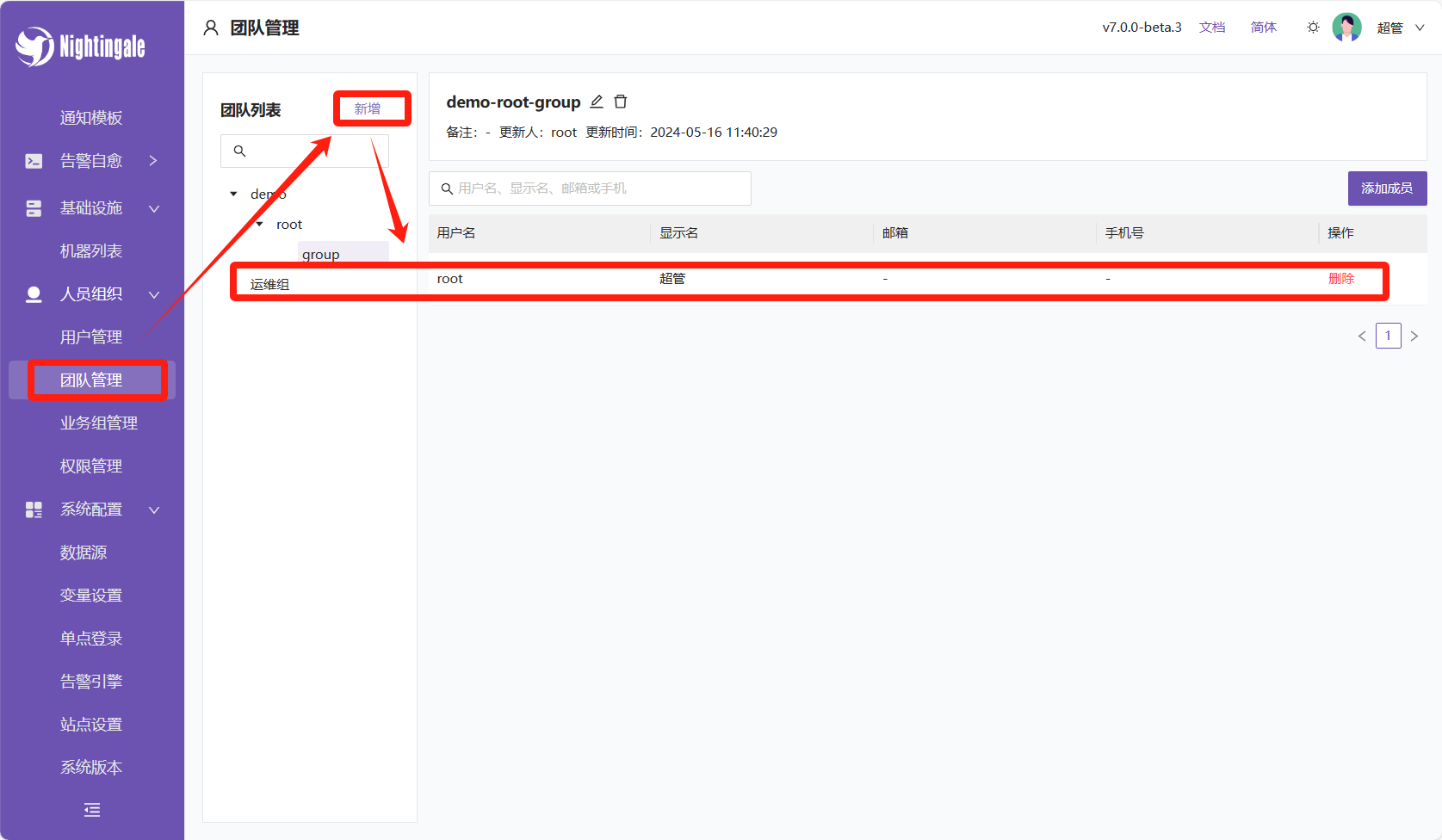 点击团队管理,新增一个运维组,将刚才创建的管理员添加进去。(可选,演示就不新建用户了。)