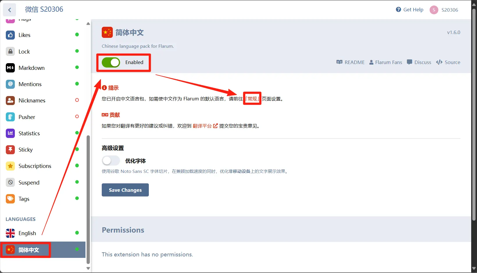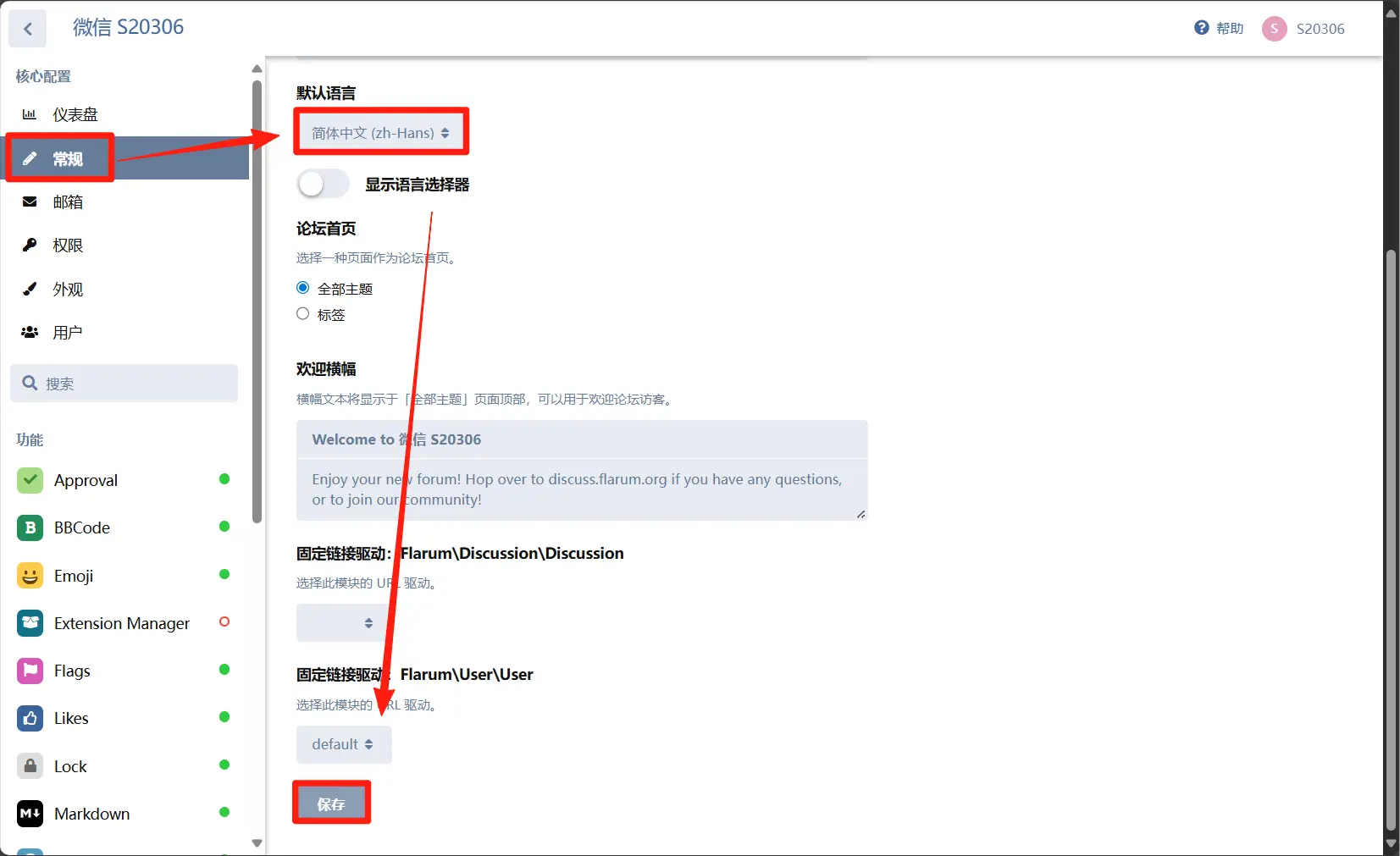 回到flarum管理员后台下拉到最后,点击中文简体,开启之后点击跳转到【常规】页面。