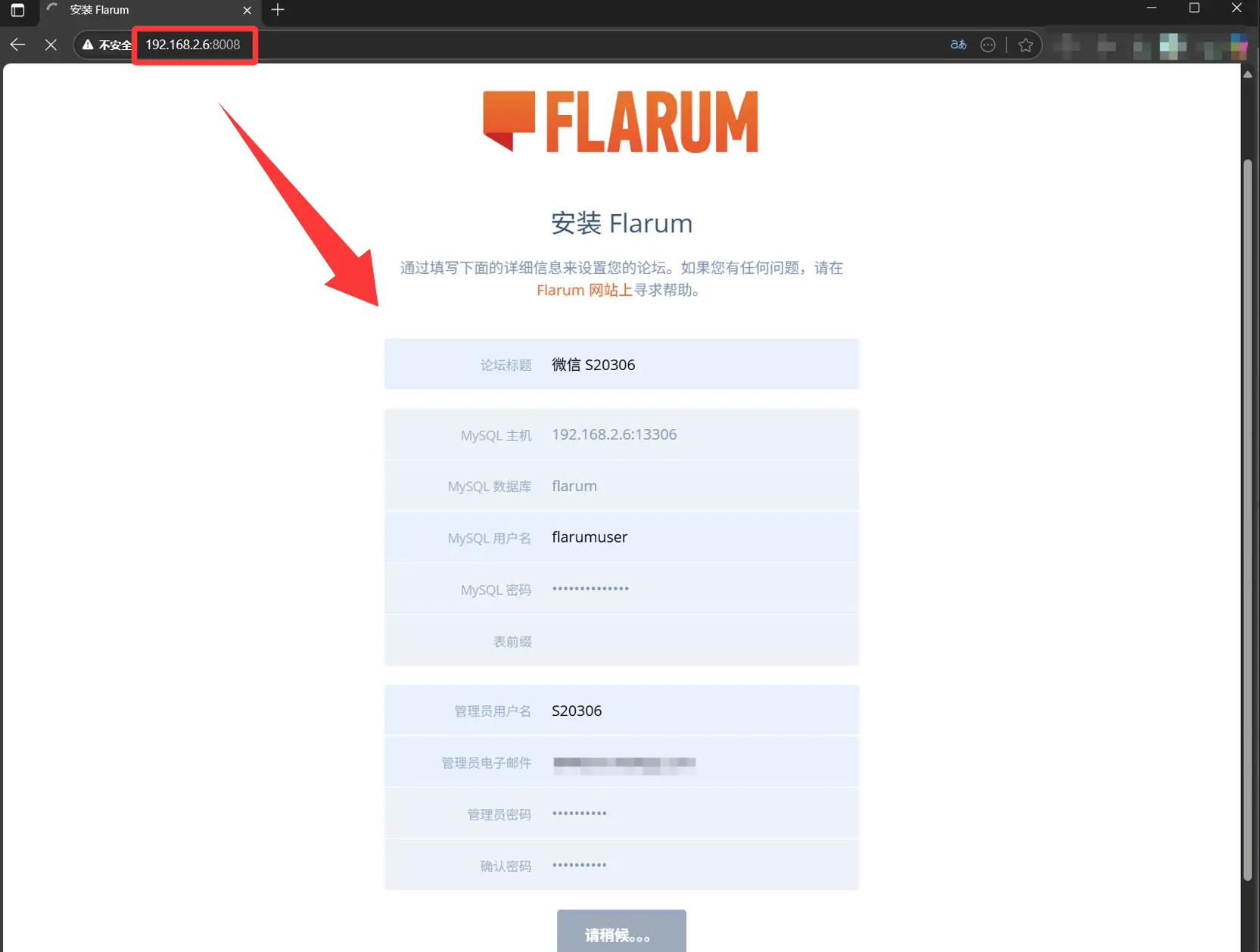 前面你创建数据库和用户的 SQL 已经写好了,所以 Flarum 安装页面可以这样填数据库连接信息(对应你创建的数据库容器信息):