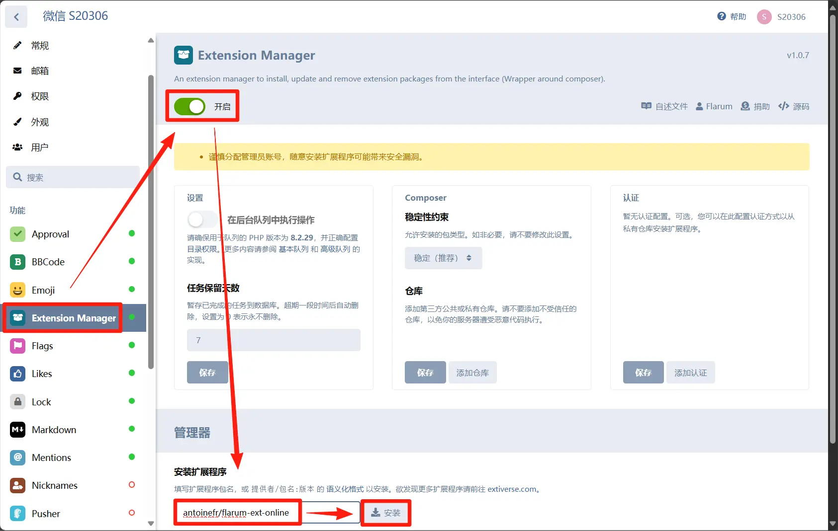 进入 Flarum 官方扩展目录,找到所需插件,在 Extension Manager 中安装即可。