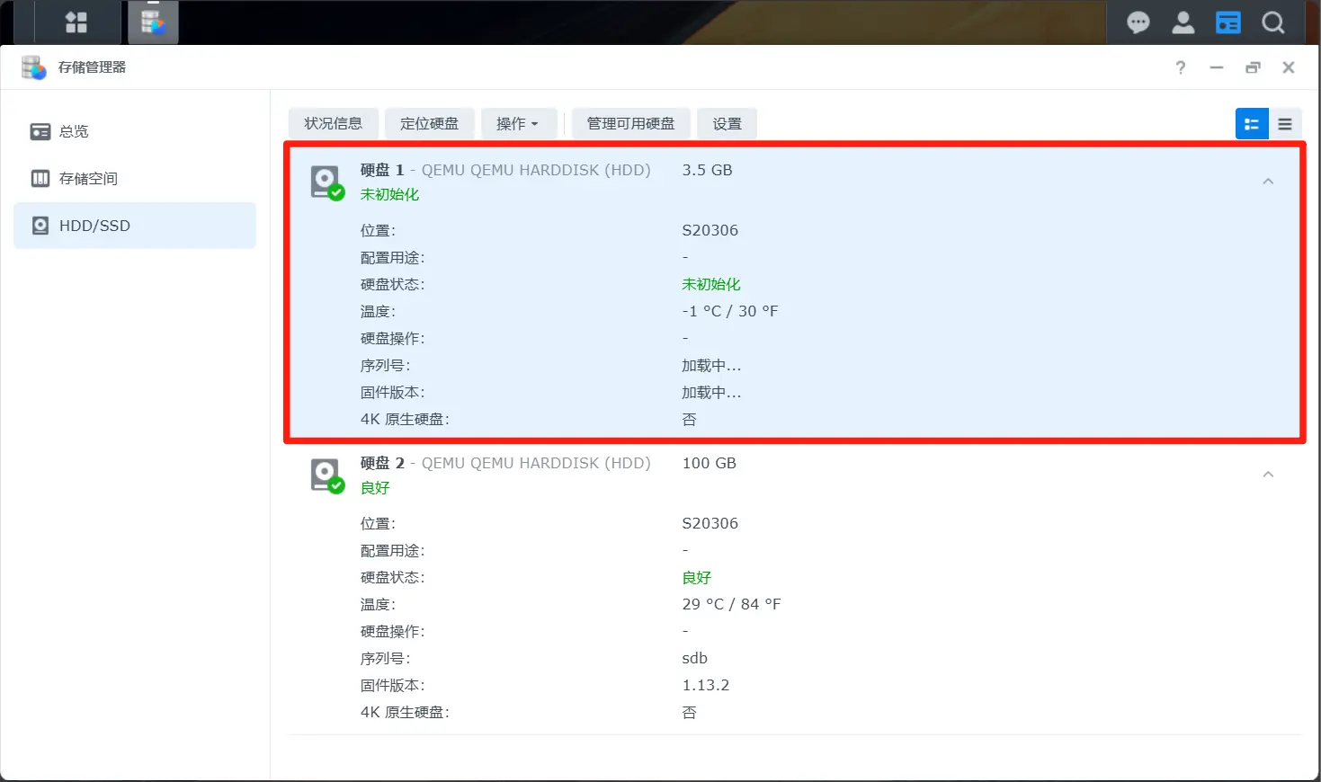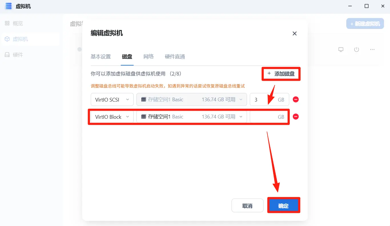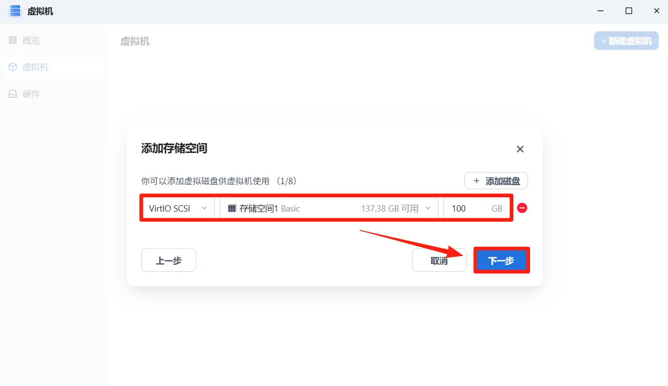 添加一个新的存储磁盘(大小按需选择,用作 DSM 存储)