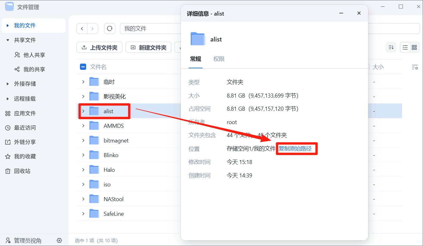 (其他NAS系统的可直接看下一步,手动创建一个文件夹再右键文件夹查看属性,复制文件夹路径进入。)# 将/vol1/1000/alist换成你自己的文件夹路径 cd /vol1/1000/alist -