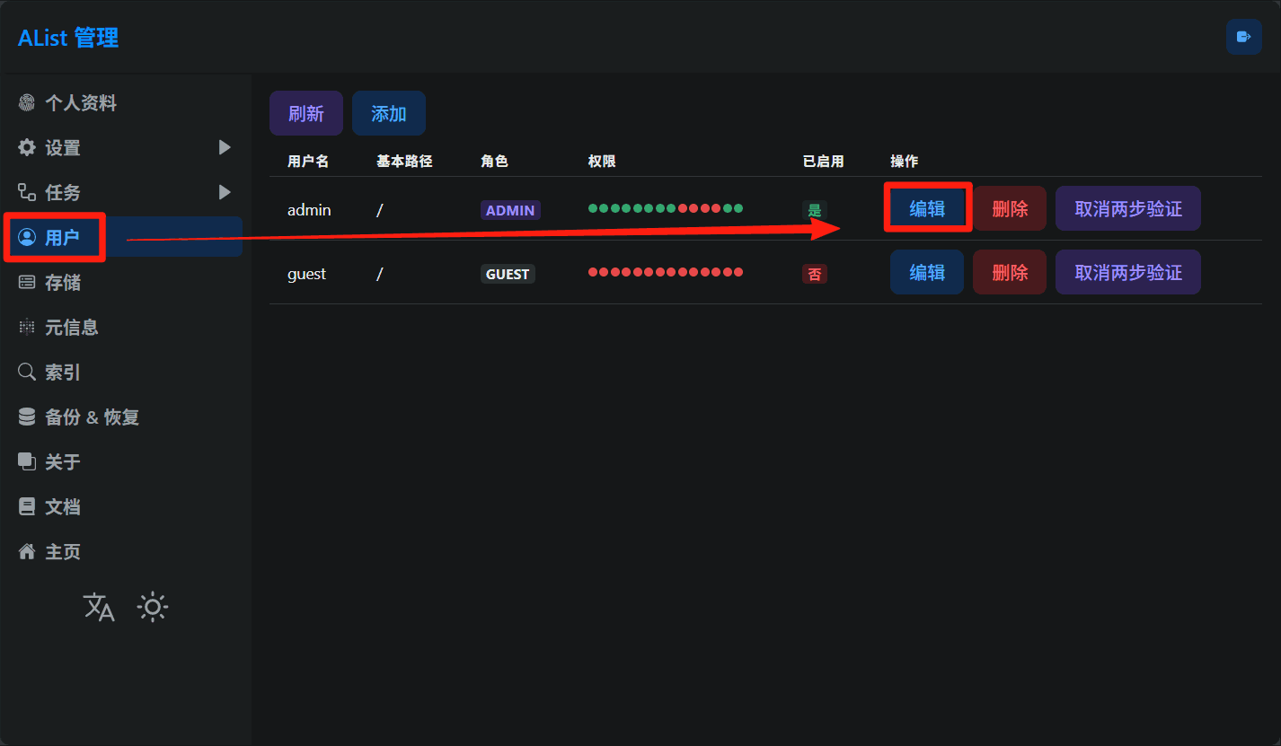 点击管理>用户>编辑(自己要修改管理员账户就现在一次性改好)