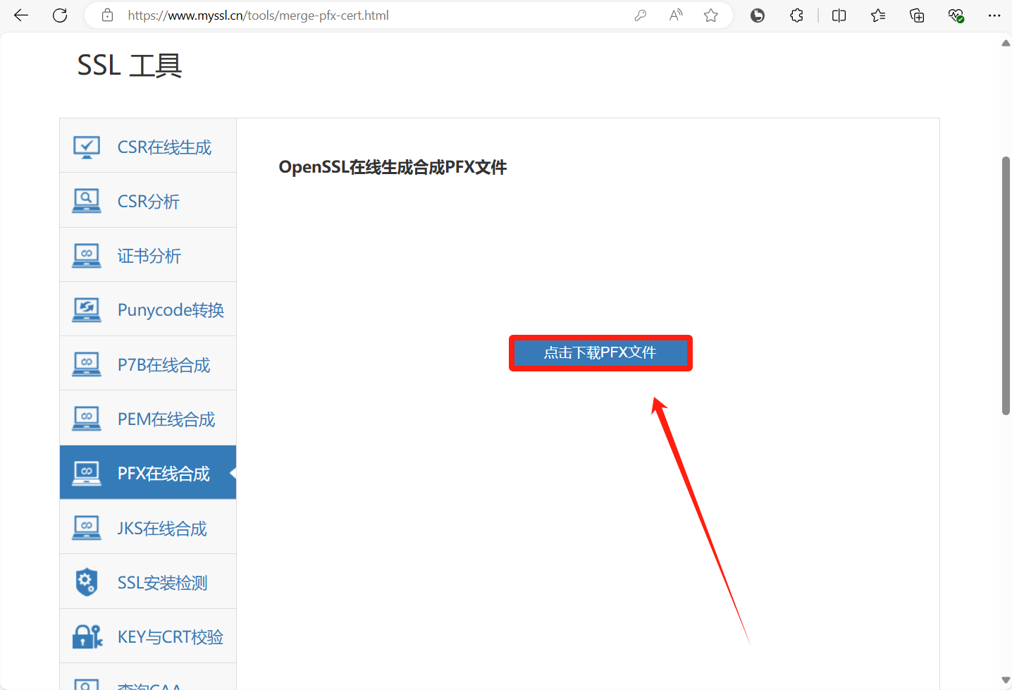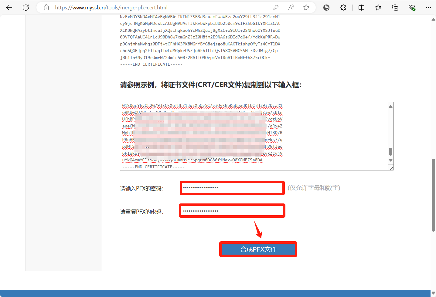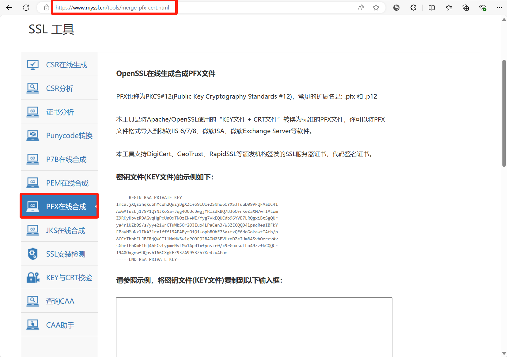 https://www.myssl.cn/tools/merge-pfx-cert.html按照当前转换工具的提示,将你的SSL证书信息粘贴上去。(如何获得对应信息看下一步骤)
