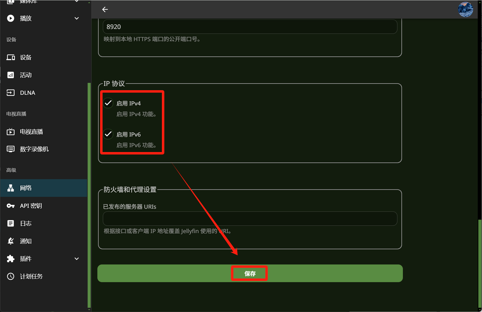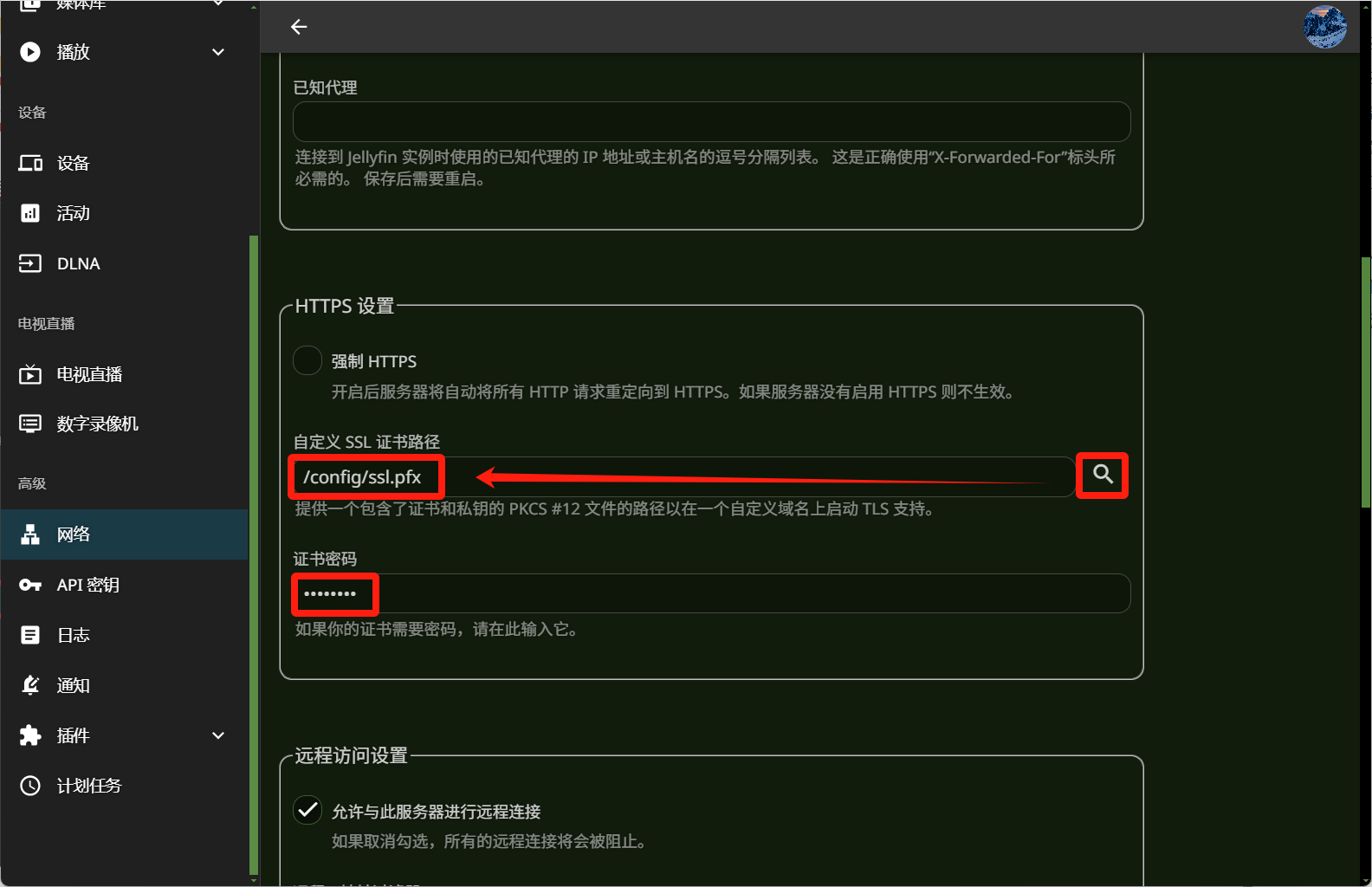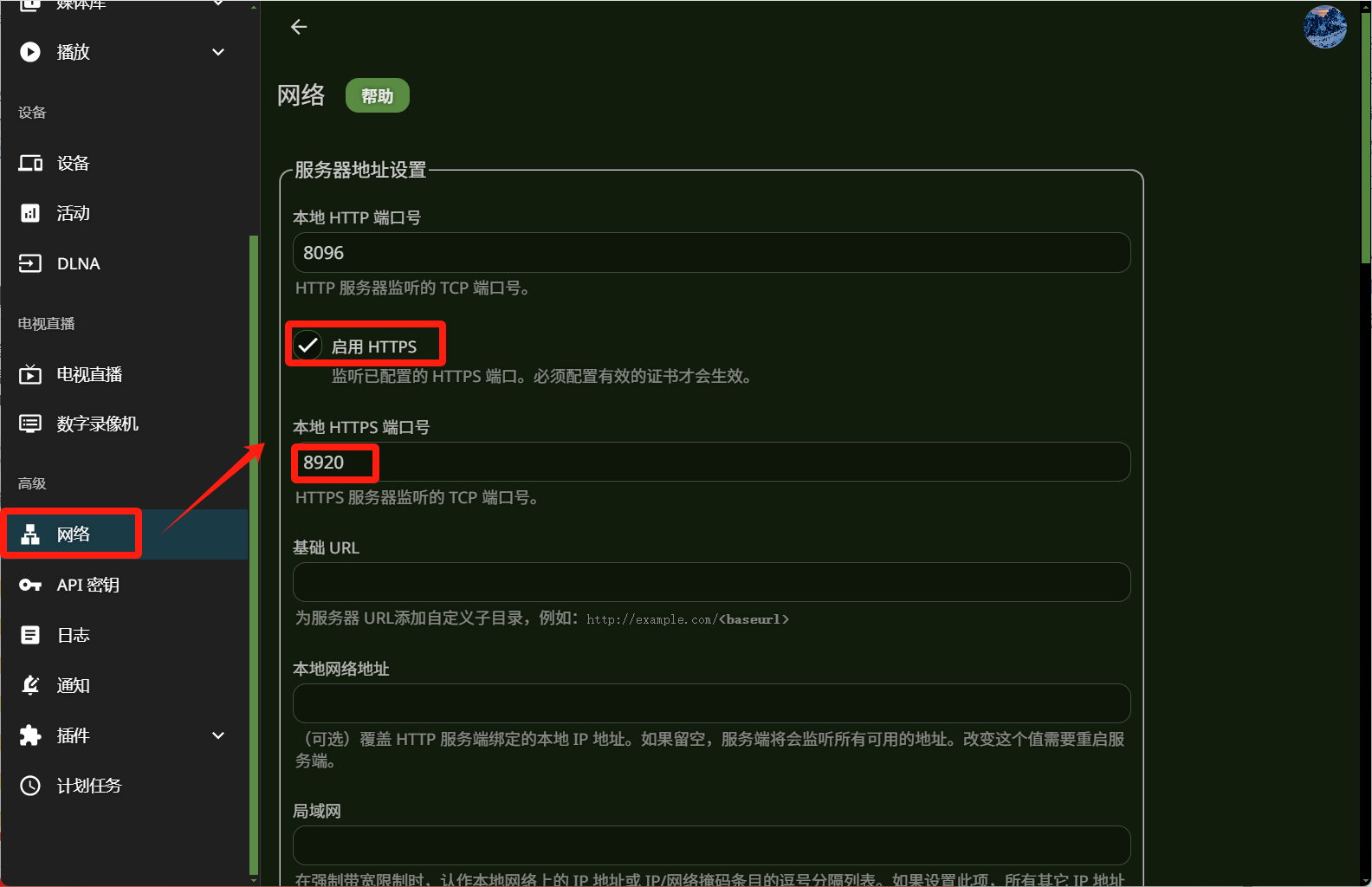 打开jellyfin--菜单--控制台--网络,勾选启用HTTPS,设置本地HTTPS端口号为8920(默认的)。