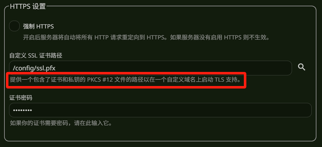 jellyfin自定义SSL的证书要求格式是包含了证书和私钥的 PKCS #12 文件
