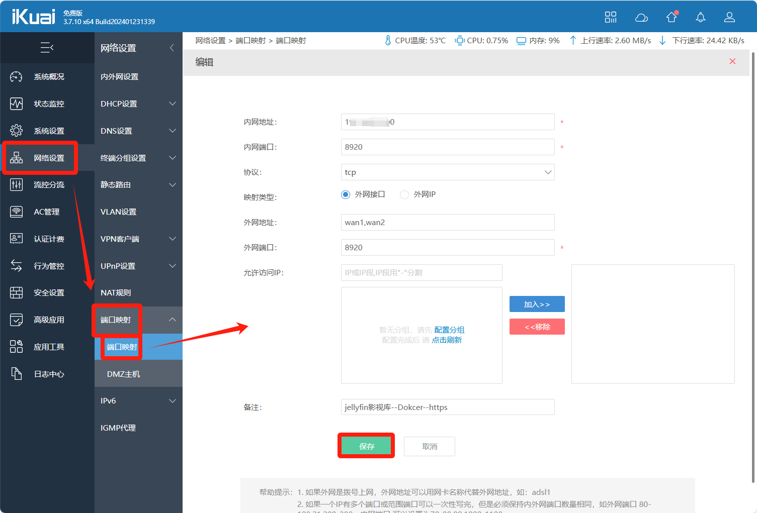 内网端口:NAS上设置的jellyfin使用的https协议的端口