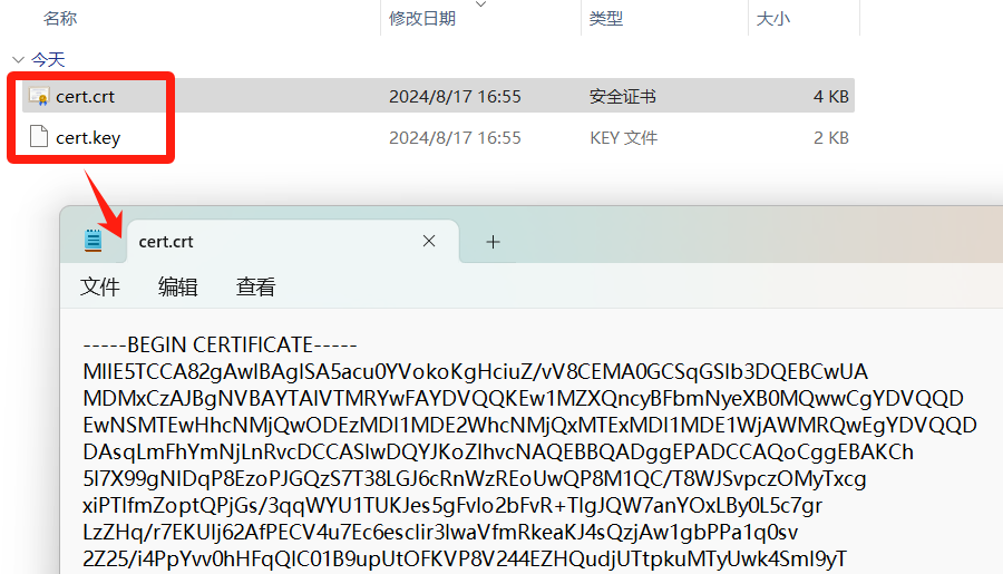 单击选中证书文件,右键选择以记事本的方式打开,全选复制其中的内容,粘贴到网页中对应的框内。