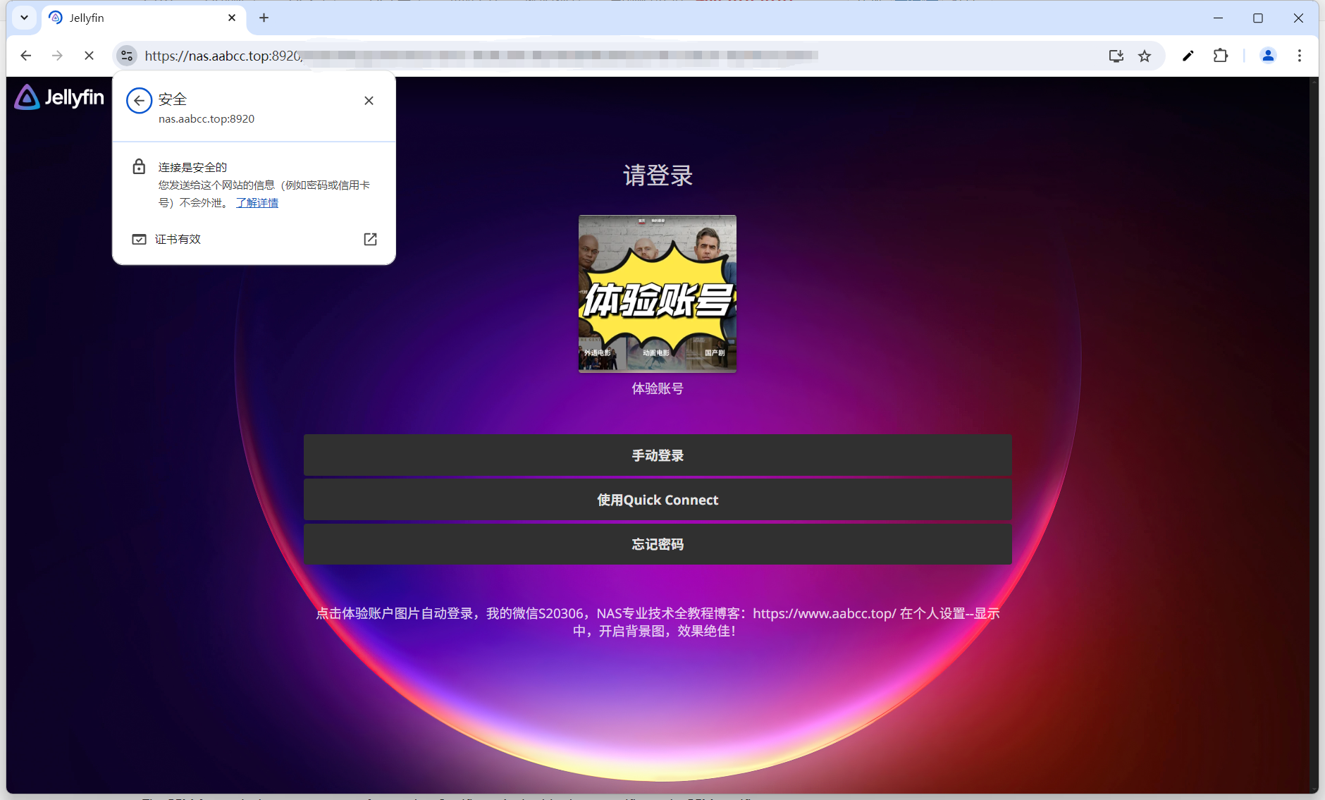 打开你的电脑浏览器,输入你的jellyfin外网访问地址,使用https://协议,端口使用8920。