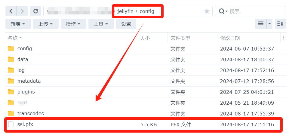 将转换后的证书文件,放到你的jellyfin容器内部路径。