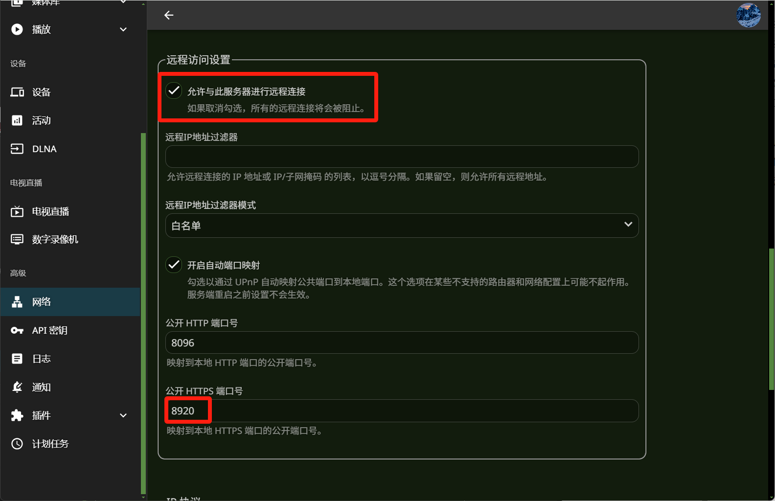 远程访问设置中,要(默认)勾选允许与此服务器进行远程连接。然后下面的公开HTTPS端口号填写为8920。