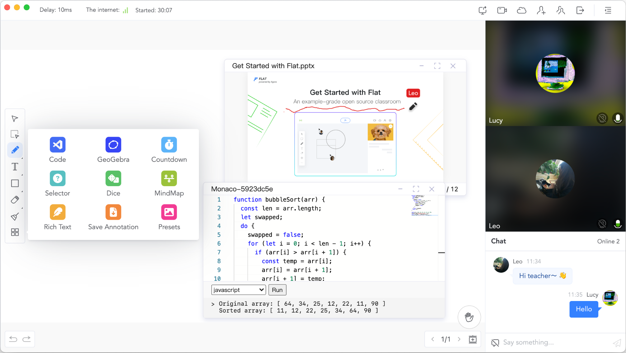 Flat 是一个实用、诚意的开源教室。实用体现在产品是基于各种成熟的云服务搭建的,具备可以直接用于实际业务的能力,它不是一个玩具。诚意体现在我们不绑死特定的云服务,包括我们自己。开发者可以替换掉一些组件,既可以使用声网Agora 的实时音视频服务,也可以使用 WebRTC。