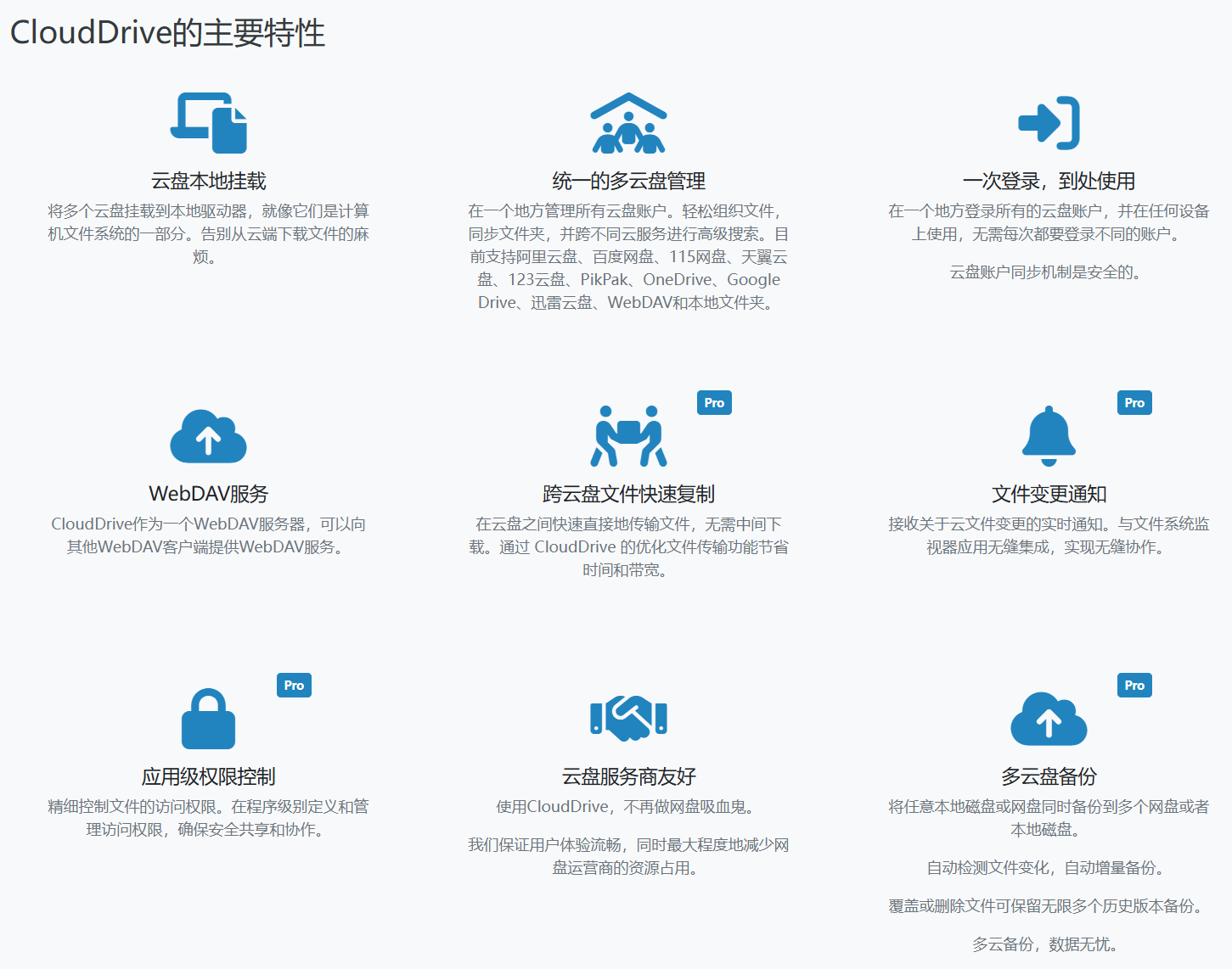 CloudDrive最引人注目的特点是其能够将多个云存储服务挂载为本地磁盘,直接访问文件而无需预先下载。想象一下,您可以将云存储服务当作本地文件系统的一部分来使用,带来的便利性不言而喻。