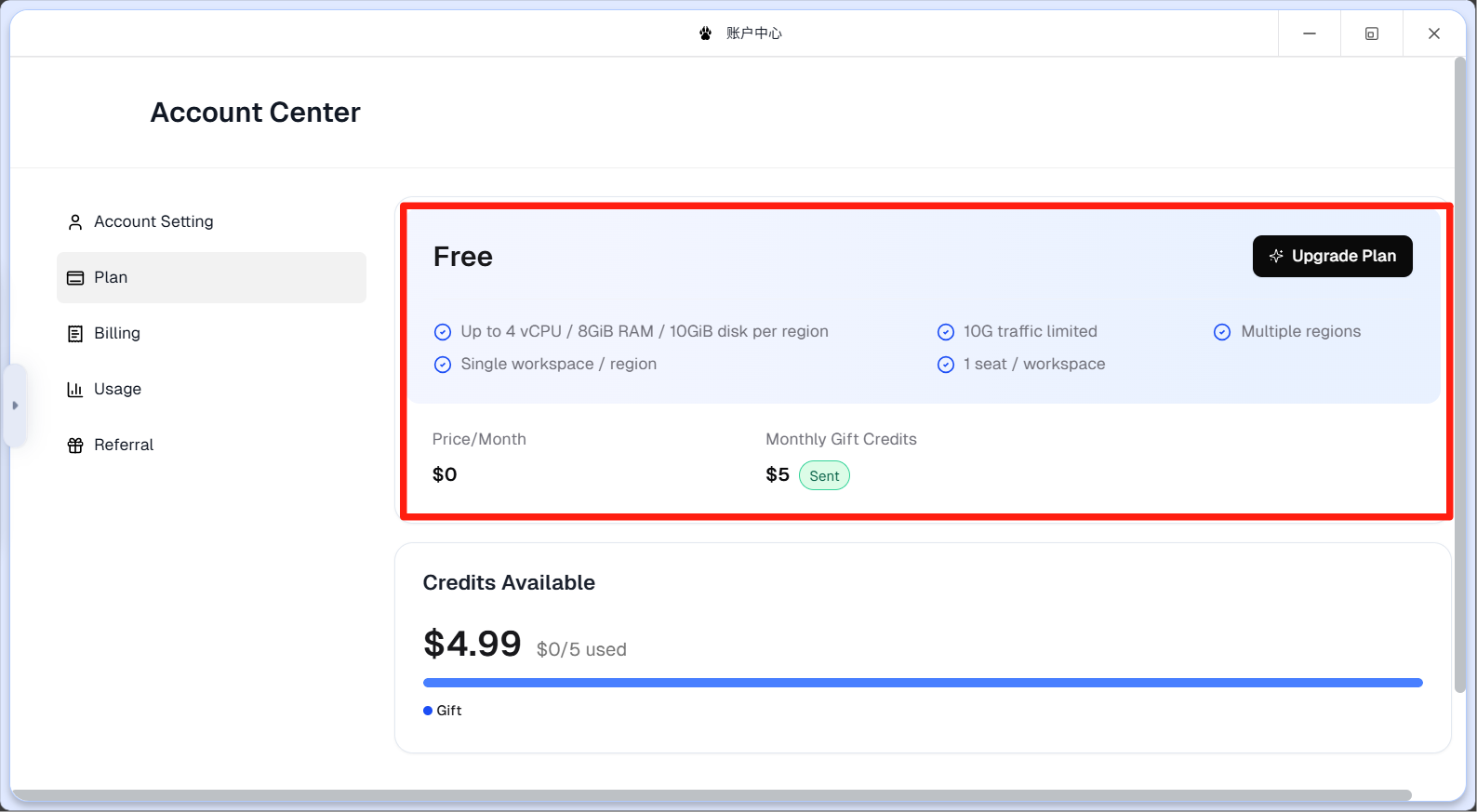 可以看到你已经自动获取免费的云服务器和5美元金额,这些额度和流量是每个月免费刷新。