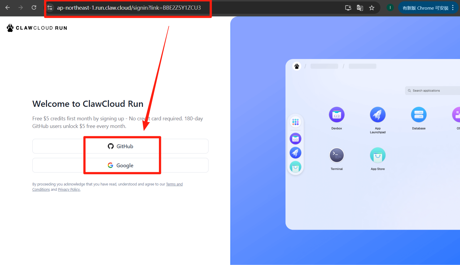 https://console.run.claw.cloud/signin?link=BBE2Z5Y1ZCU3使用GitHub或者Google账户进行登录注册