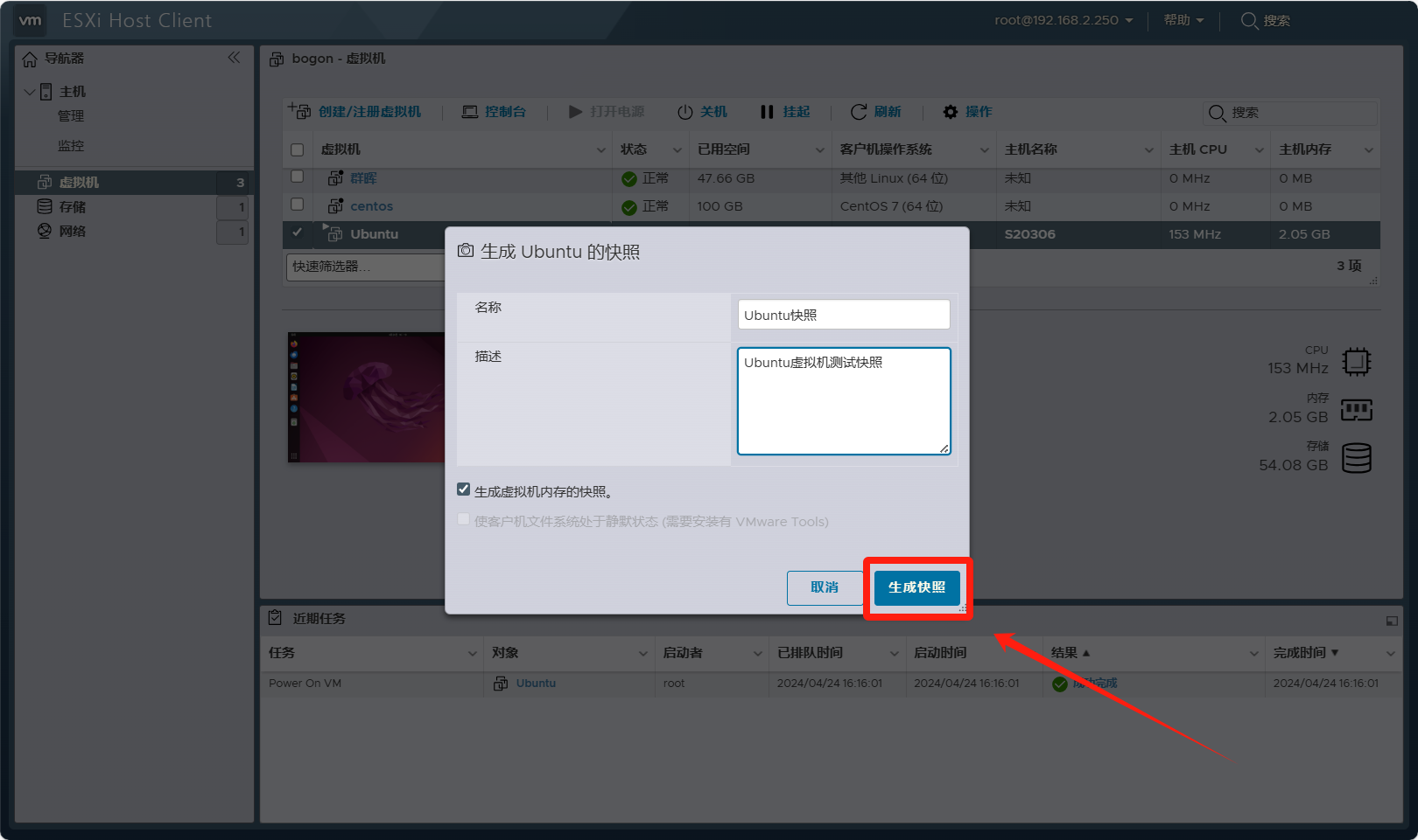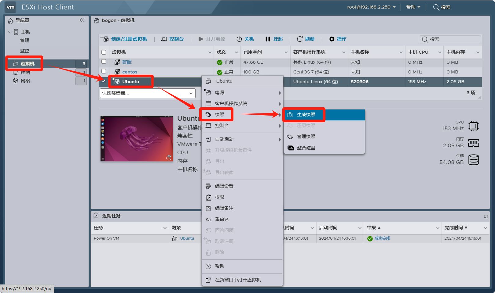 访问VMware ESXi Web客户端并登录你的账户,找到你想要拍摄快照的虚拟机,右键单击它并选择“快照”>“生成快照”。